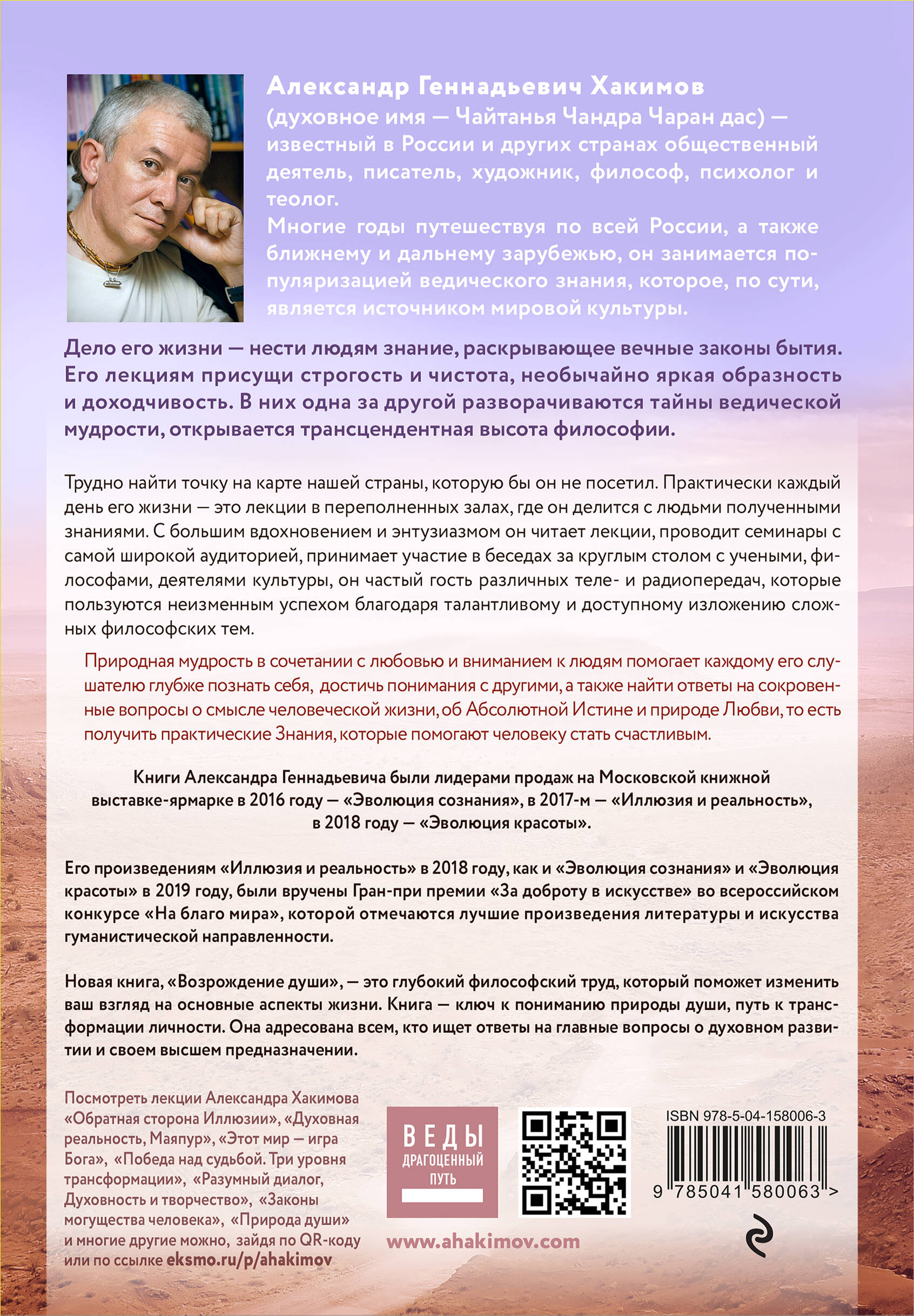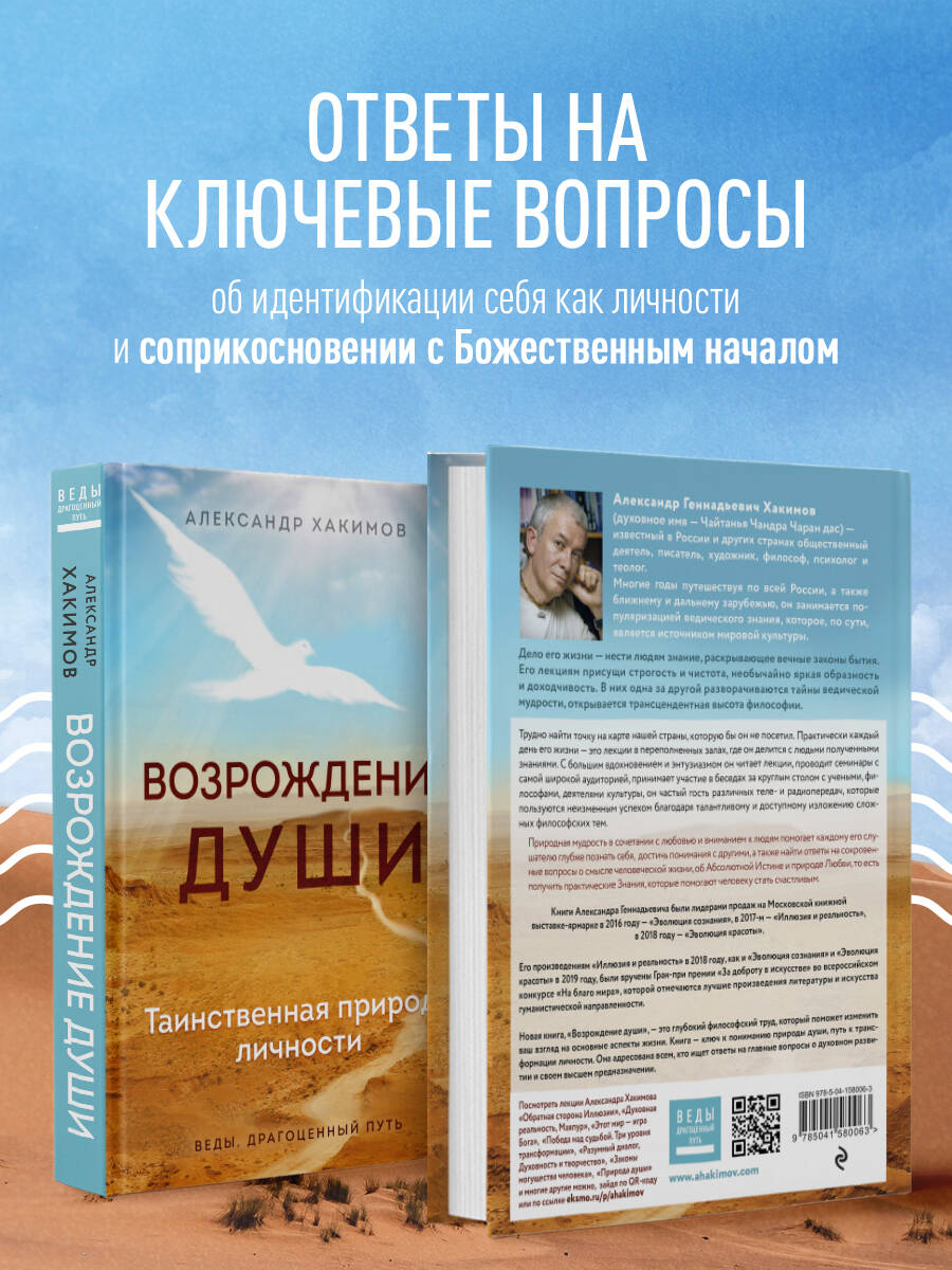 Что такое «душа»? Чем она отличается от «личности»? Почему человек в поиске себя самого неизбежно сталкивается с необходимостью осознать Личность Бога? На эти и многие другие вопросы дает ответ новая книга известного в России и за рубежом специалиста по ведической культуре Александра Хакимова (духовное имя - Чайтанья Чандра Чаран дас). Исследуя человеческую душу, автор опирается на древнее, проверенное тысячелетиями знание, которое он излагает понятным современному читателю языком. Неудивительно, что книга, как и лекции Александра Геннадьевича, привлекают людей неординарных, мыслящих, готовых отказаться от привычных «ценностей» мира - ценностей навязанных, которые на самом деле только отвлекают нас от действительно важных задач. Александр Хакимов дает нам шанс отбросить ненужное и сосредоточиться на главном - на духовном развитии, на понимании необходимости возрождения нашей души.| Издательство | Эксмо |
