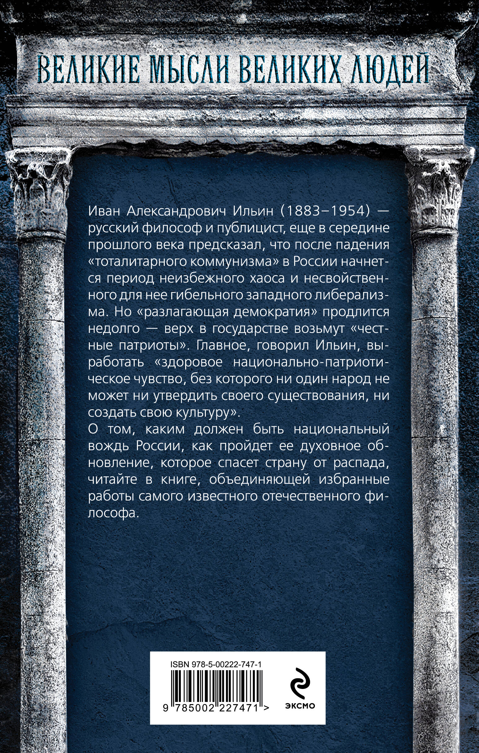 Иван Александрович Ильин (1883-1954) - русский философ и публицист, еще в середине прошлого века предсказал, что после падения «тоталитарного коммунизма» в России начнется период неизбежного хаоса и несвойственного для нее гибельного западного либерализма. Но «разлагающая демократия» продлится недолго - верх в государстве возьмут «честные патриоты». Главное, говорил Ильин, выработать «здоровое национально-патриотическое чувство, без которого ни один народ не может ни утвердить своего существования, ни создать свою культуру». О том, каким должен быть национальный вождь России, как пройдет ее духовное обновление, которое спасет страну от распада, читайте в книге, объединяющей избранные работы самого известного отечественного философа.| Издательство | Родина Издательство ООО |