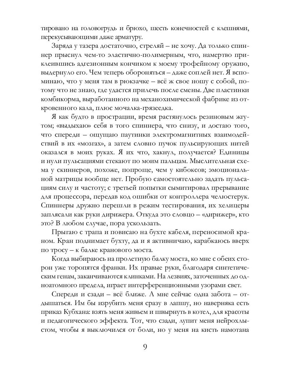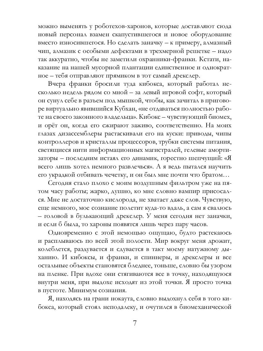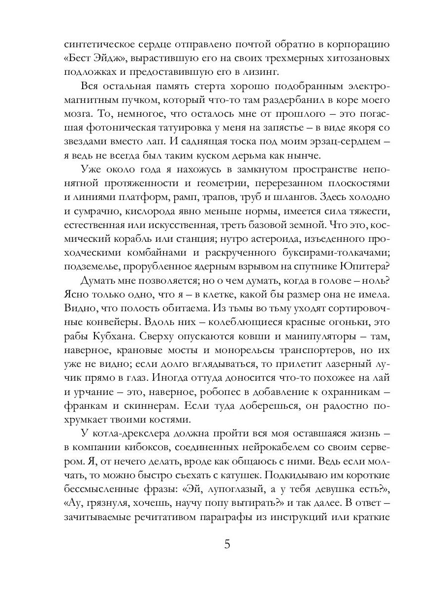 Сборник повестей и рассказов самобытного, зрелого, не похожего ни на кого «отца-основателя» русского киберпанка. Александр Тюрин создает удивительные миры, где эволюционирующая цифровая жизнь замещает привычную нам природу, а технологии достигли такого уровня, что перестали нуждаться в хозяине-человеке. Лишенный памяти раб на техноплантации, затерянной в Поясе астероидов. С побега начинается его тернистый путь через космические джунгли, когда из друзей только косматый роботех. Путь этот ведет не только по Солнечной системе, к далекой Родине, но и вглубь, к осознанию себя. Активизация «спящей» части генома у героя приводит к плачевным последствиям для экспериментаторов и интересному пополнению животного мира Арктики. Виртуальная, сконструированная жизнь, похожая на прекрасный сон, заменяет реальность у обитателей некой «молодой демократии». Она всегда с ними, чем бы они не занимались в реале. Но они даже не догадываются, какие действующие лица вызревают в этом «сне». Квазиживое техносущество, являющееся продуктом молекулярного сборщика, осознает себя человеком. Созданный для уничтожения космических поселений, он начинает понимать порочность той силы, орудием которой является. Красоты и опасности высокотехнологичного будущего, а также незабываемость прошлого в таком городе, как Питер. Провинциалка и космофлотец совместно борются с внеземной заразой, к распространению которой приложила руку вполне земная корпорация. Искусственный кольцевой мир, где микро- и макромашины замещают собой фауну, флору, человеческие тела, а героя можно разобрать, собрать, переформатировать. Но он пускается в путь, чтобы помочь своим близким. Эти и другие произведения сборника создают причудливую мозаику киберпанка, «твердой» и боевой фантастики, обильно приправленную отвязным юмором, что, собственно, и является «фирменным стилем» Александра Тюрина.| Издательство | Т8 RUGRAM |