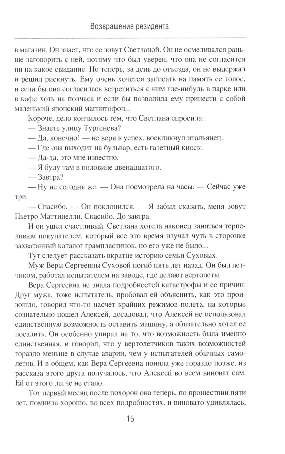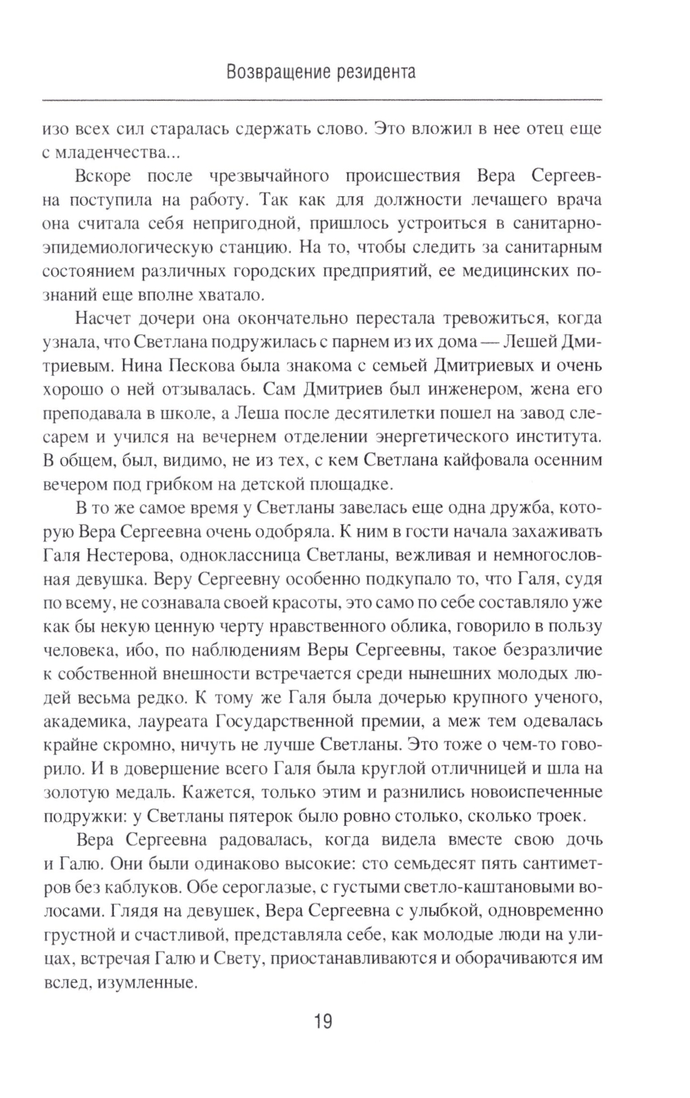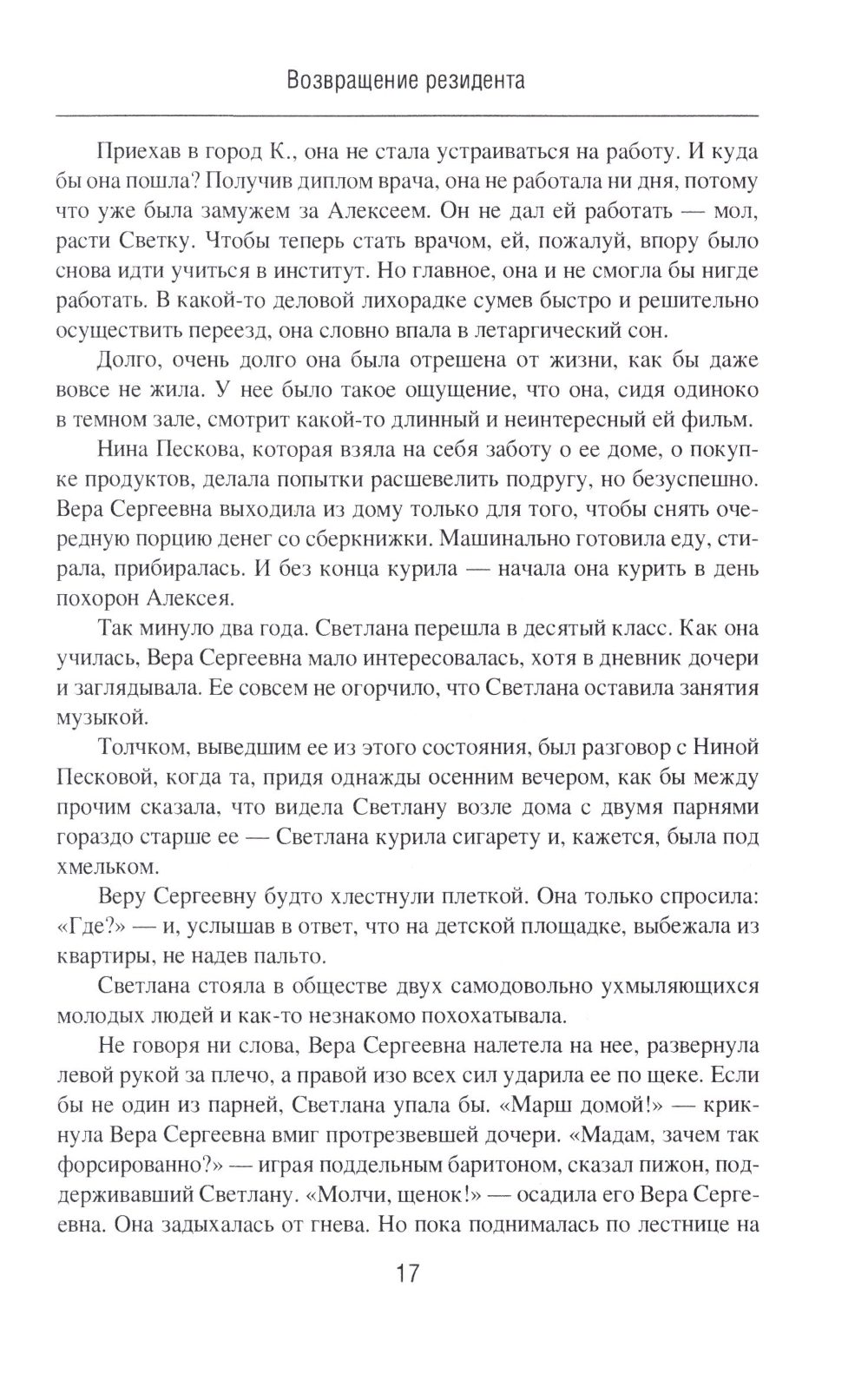 В продолжении приключенческого цикла о резиденте Михаил Тульев возвращается к своим прежним «хозяевам» и подвергается жесткой проверке. Он возобновляет работу в западной разведслужбе, но уже как советский разведчик по линии Первого главного управления КГБ СССР. Ему удается выявить местонахождение гитлеровского преступника Гофмана, некогда приговоренного к смертной казни, а также установить личность убийцы своего отца... Фильм «Возвращение резидента» был снят в 1982 году режиссером Вениамином Дорманом, в главных ролях: Георгий Жженов, Евгений Киндинов, Вадим Захарченко.| Издательство | Вече |
