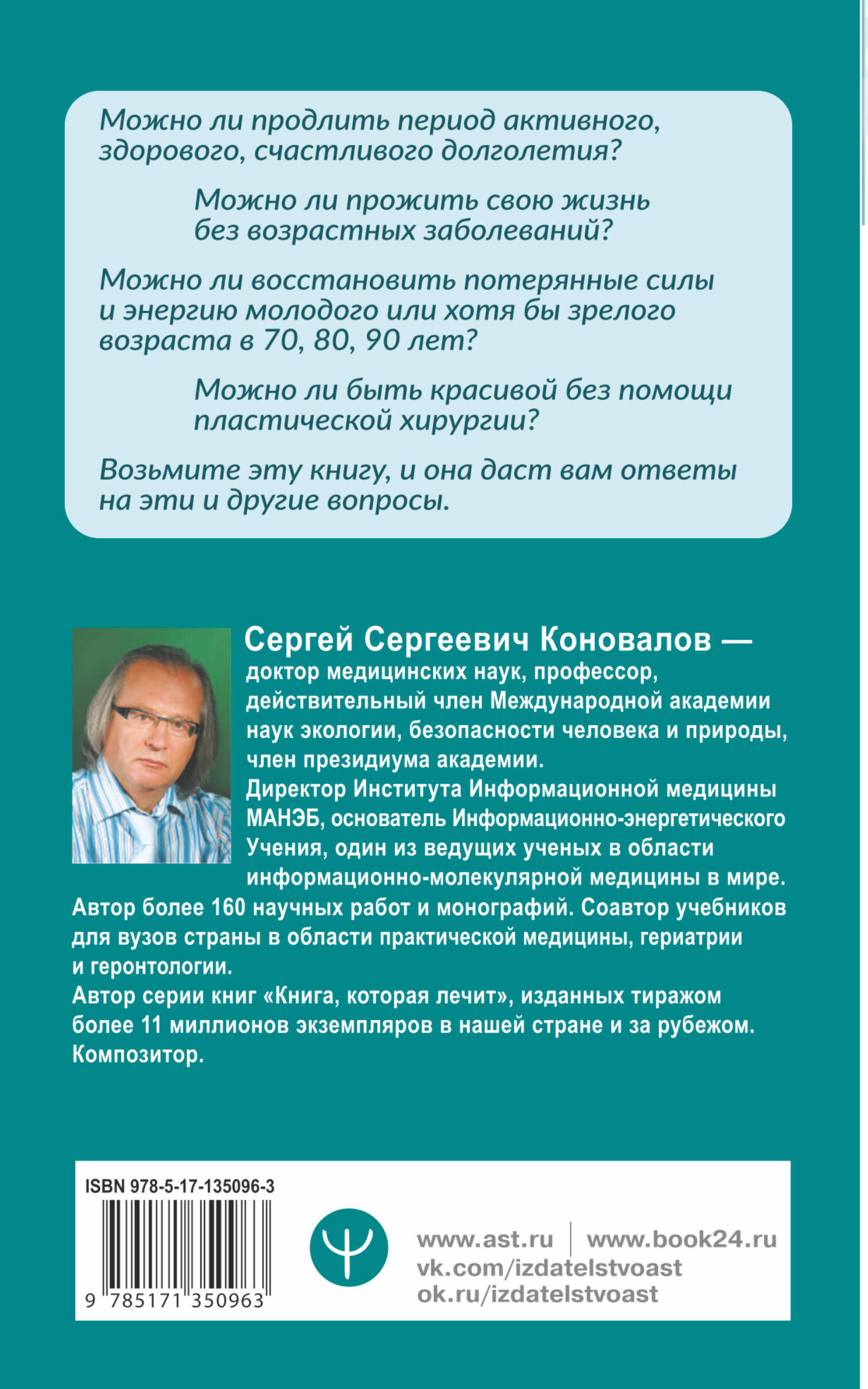 Новая книга всемирно известного врача, профессора С. С. Коновалова ломает сложившиеся стереотипы о неизбежности возрастных изменений, утрате физических сил и угасании интеллектуальных возможностей. Десятки тысяч пациентов-студентов Доктора уже доказали: Информационно-энергетическое Учение открывает возможность возвращения в жизнь для человека любого возраста - в жизнь активную, здоровую, полную новых знаний и свершений! Новейшие открытия Информационной медицины и практические советы людям старшего возраста - это путь к счастливому долголетию. Но эта книга не только для людей, вступивших в пору зрелого возраста. Она адресована каждому, кто открыт новым знаниям и хочет жить насыщенно, счастливо и максимально долго.| Издательство | Издательство "АСТ" |