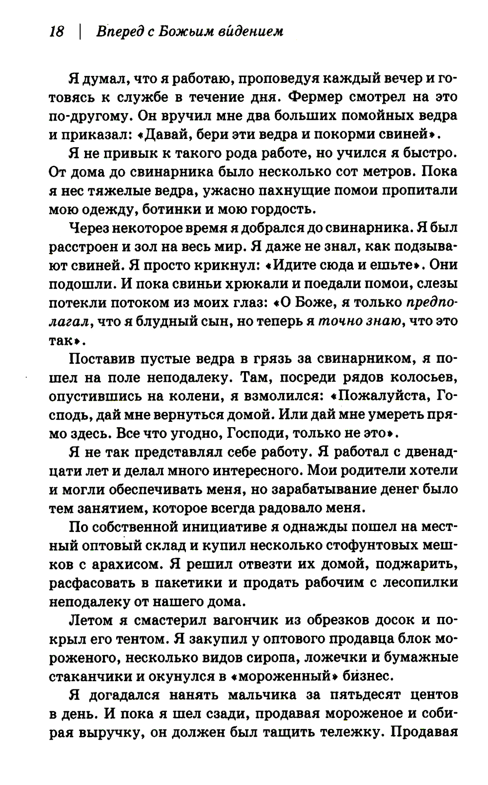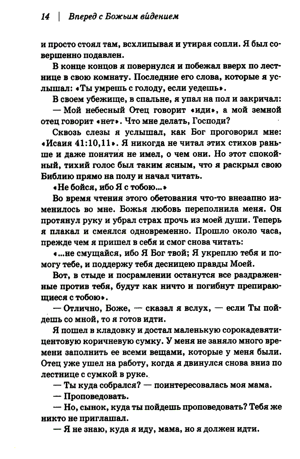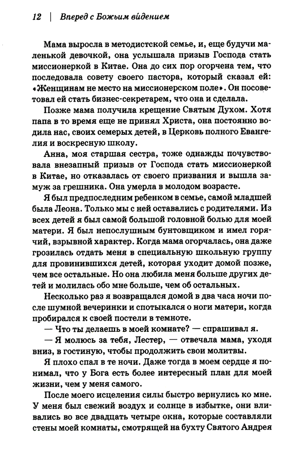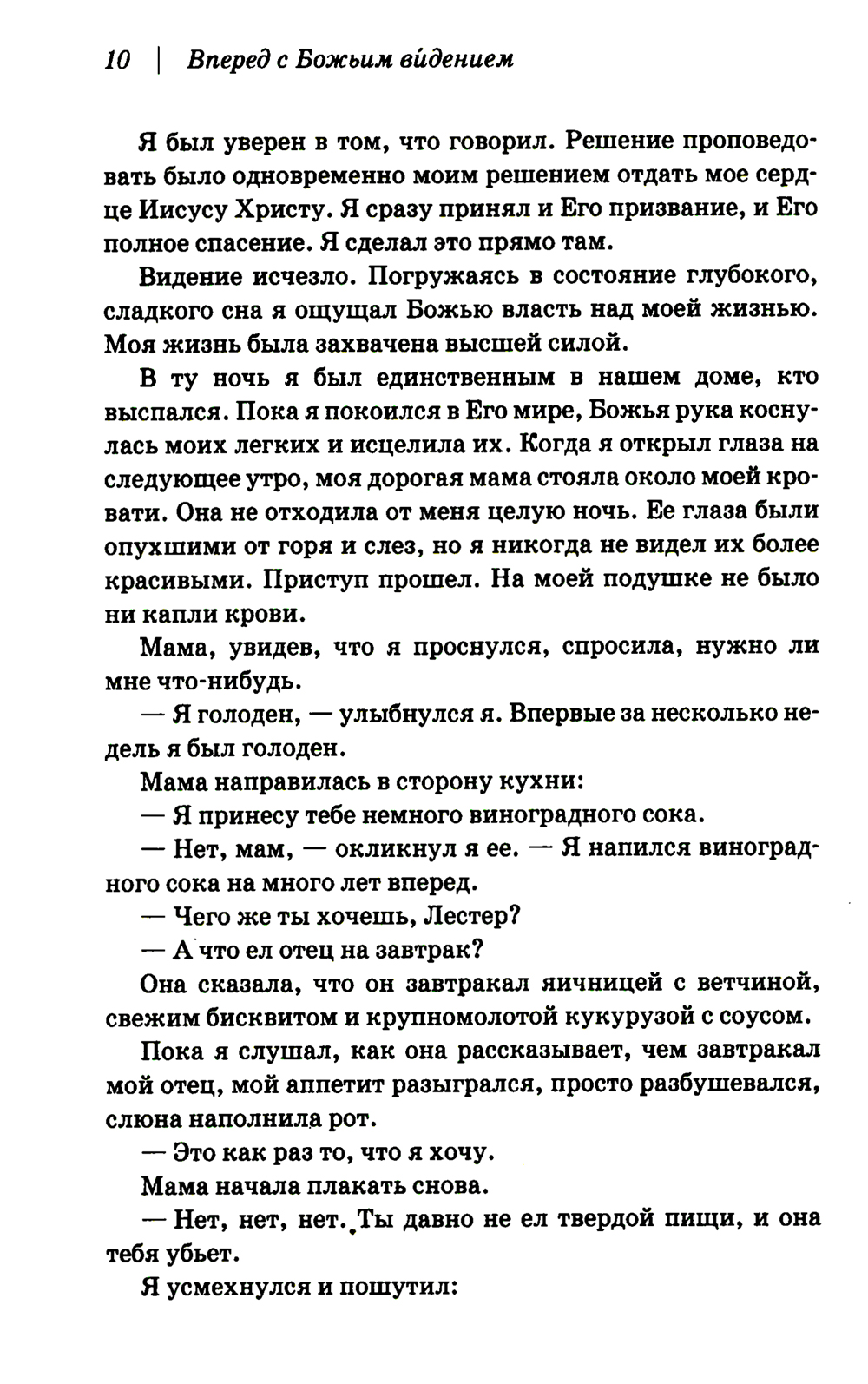 Англия, Франция, Иерусалим, Австралия, Манила, Гонконг, Саут-Бенд, штат Индиана... Преданный, целеустремленный и неутомимый Лестер Самралл принял близко к сердцу призыв Господа «идти по всему миру и проповедовать Евангелие всей твари». В возрасте семнадцати лет Лестеру пришлось выбирать между смертью и служением Богу. И он выбрал проповедь Евангелия, после чего вся его жизнь стала приключением, которое превосходит любое самое пылкое воображение. «Вперед с Божьим видением» это история жизни известного всему миру проповедника, посвятившего себя служению человечеству. Его Бог любит всех людей, в какой бы стране они ни проживали Лестер Самралл любил говорить: «Когда вы питаете веру, ваши сомнения начинают испытывать голод». Эта книга тоже станет хорошим питанием для вашей веры.| Издательство | Библейский взгляд |