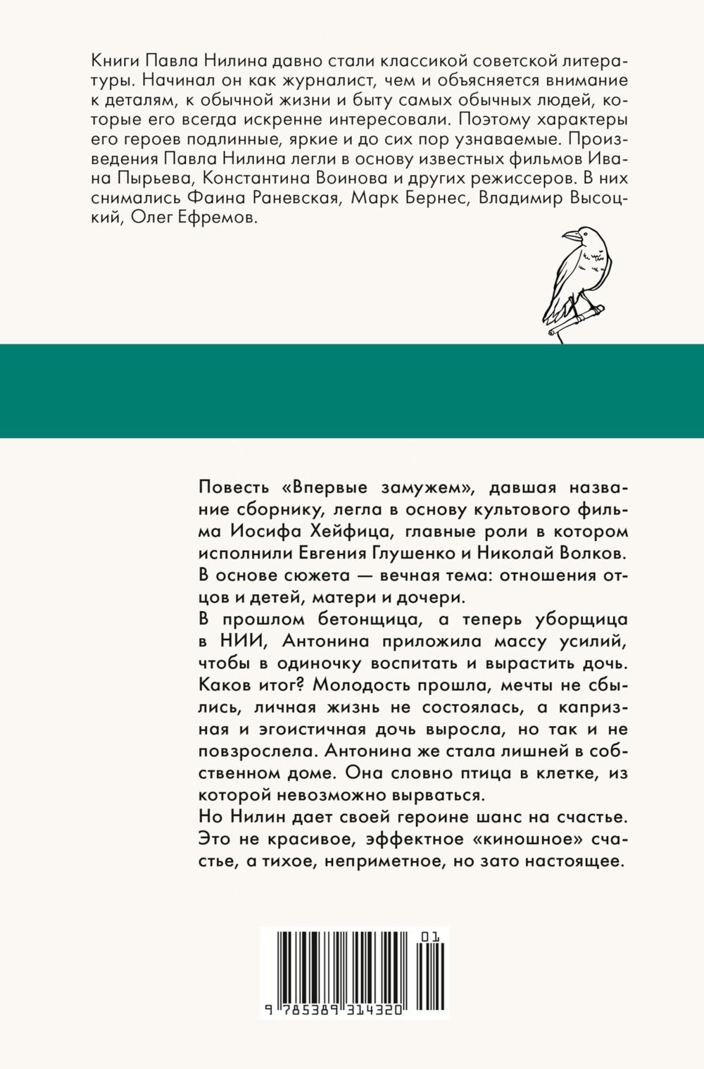 Книги Павла Нилина давно стали классикой советской литературы. Начинал он как журналист, чем и объясняется внимание к деталям, к обычной жизни и быту самых обычных людей, которые его всегда искренне интересовали. Поэтому характеры его героев подлинные, яркие и до сих пор узнаваемые. Произведения Павла Нилина легли в основу известных фильмов Ивана Пырьева, Константина Воинова и других режиссеров. В них снимались Фаина Раневская, Марк Бернес, Владимир Высоцкий, Олег Ефремов. Повесть «Впервые замужем», давшая название сборнику, легла в основу культового фильма Иосифа Хейфица, главные роли в котором исполнили Евгения Глушенко и Николай Волков. В основе сюжета - вечная тема: отношения отцов и детей, матери и дочери. В прошлом бетонщица, а теперь уборщица в НИИ, Антонина приложила массу усилий, чтобы в одиночку воспитать и вырастить дочь. Каков итог? Молодость прошла, мечты не сбылись, личная жизнь не состоялась, а капризная и эгоистичная дочь выросла, но так и не повзрослела. Антонина же стала лишней в собственном доме. Она словно птица в клетке, из которой невозможно вырваться. Но Нилин дает своей героине шанс на счастье. Это не красивое, эффектное «киношное» счастье, а тихое, неприметное, но зато настоящее.| Издательство | КоЛибри |