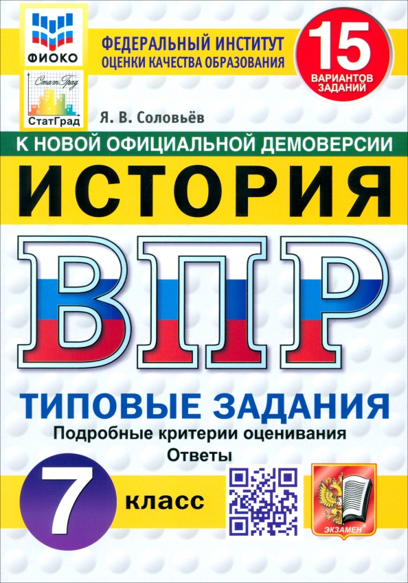 Данное пособие полностью соответствует федеральному государственному образовательному стандарту. Книга содержит 15 вариантов типовых заданий Всероссийской проверочной работы (ВПР) по истории для учащихся 7-х классов. Сборник предназначен учащимся 7-х классов, учителям и методистам, использующим типовые задания для подготовки к Всероссийской проверочной работе по истории. Я. В. Соловьёв - кандидат исторических наук, доцент кафедры истории России Государственного университета просвещения, старший научный сотрудник Научно-просветительского отдела Государственной публичной исторической библиотеки России, автор пособий по истории России, ЕГЭ, ОГЭ и ВПР.