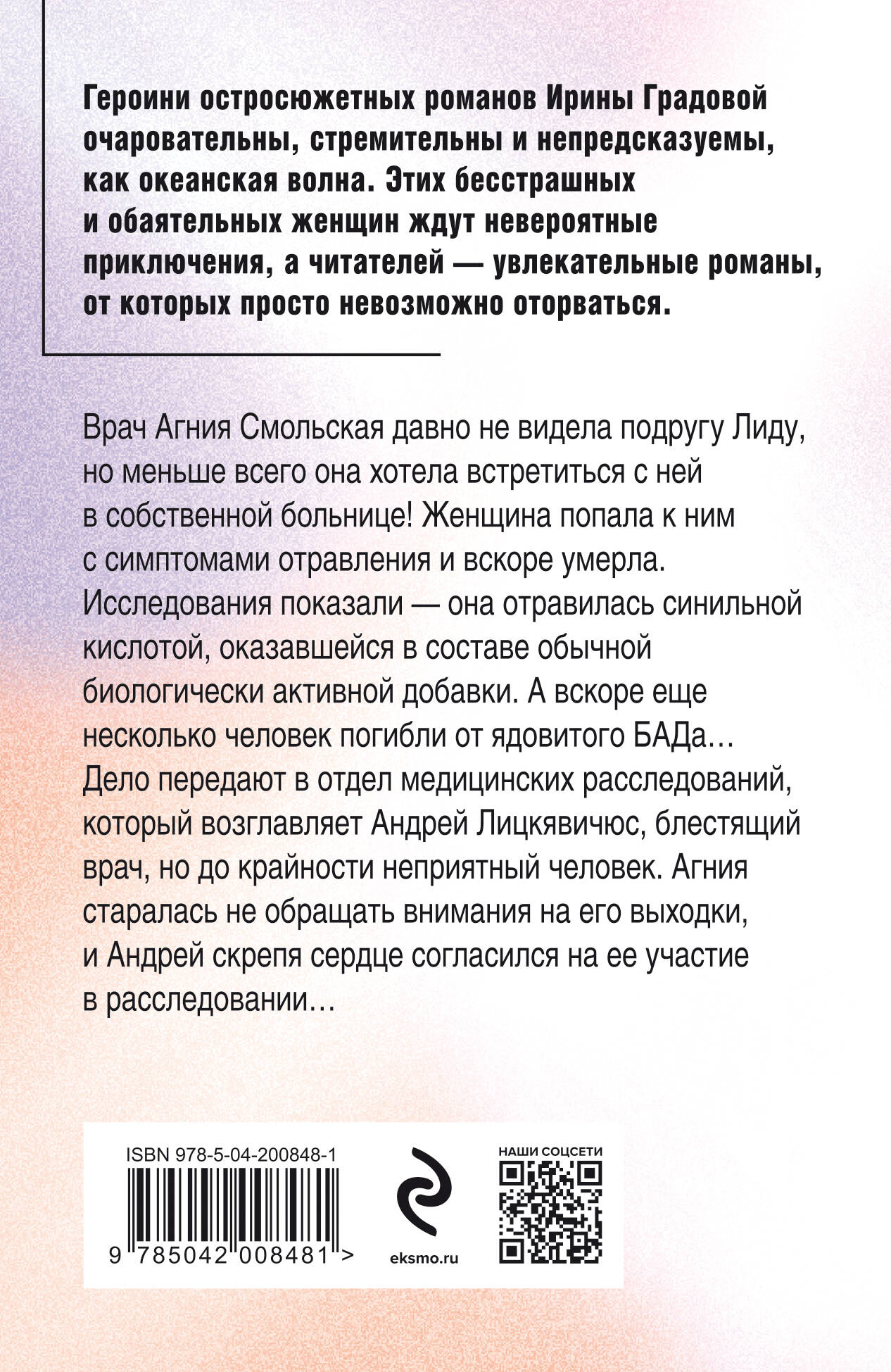 Врач Агния Смольская давно не видела подругу Лиду, но меньше всего она хотела встретиться с ней в собственной больнице! Женщина попала к ним с симптомами отправления, и вскоре умерла. Исследования показали - она отравилась синильной кислотой, оказавшейся в составе обычной биологически активной добавки. А вскоре еще несколько человек погибли от ядовитого БАДа… Дело передают в отдел медицинских расследований, который возглавляет Андрей Лицкявичюс, блестящий врач, но до крайности неприятный человек. Агния старалась не обращать внимания на его выходки, и Андрей скрепя сердце согласился на ее участие в расследовании… Героини остросюжетных романов Ирины Градовой очаровательны, стремительны и непредсказуемы, как океанская волна - самая настоящая стихия. Этих бесстрашных и обаятельных женщин ждут невероятные приключения, а читателей - увлекательные романы, от которых просто невозможно оторваться.| Издательство | ООО "Издательство "Эксмо" |
