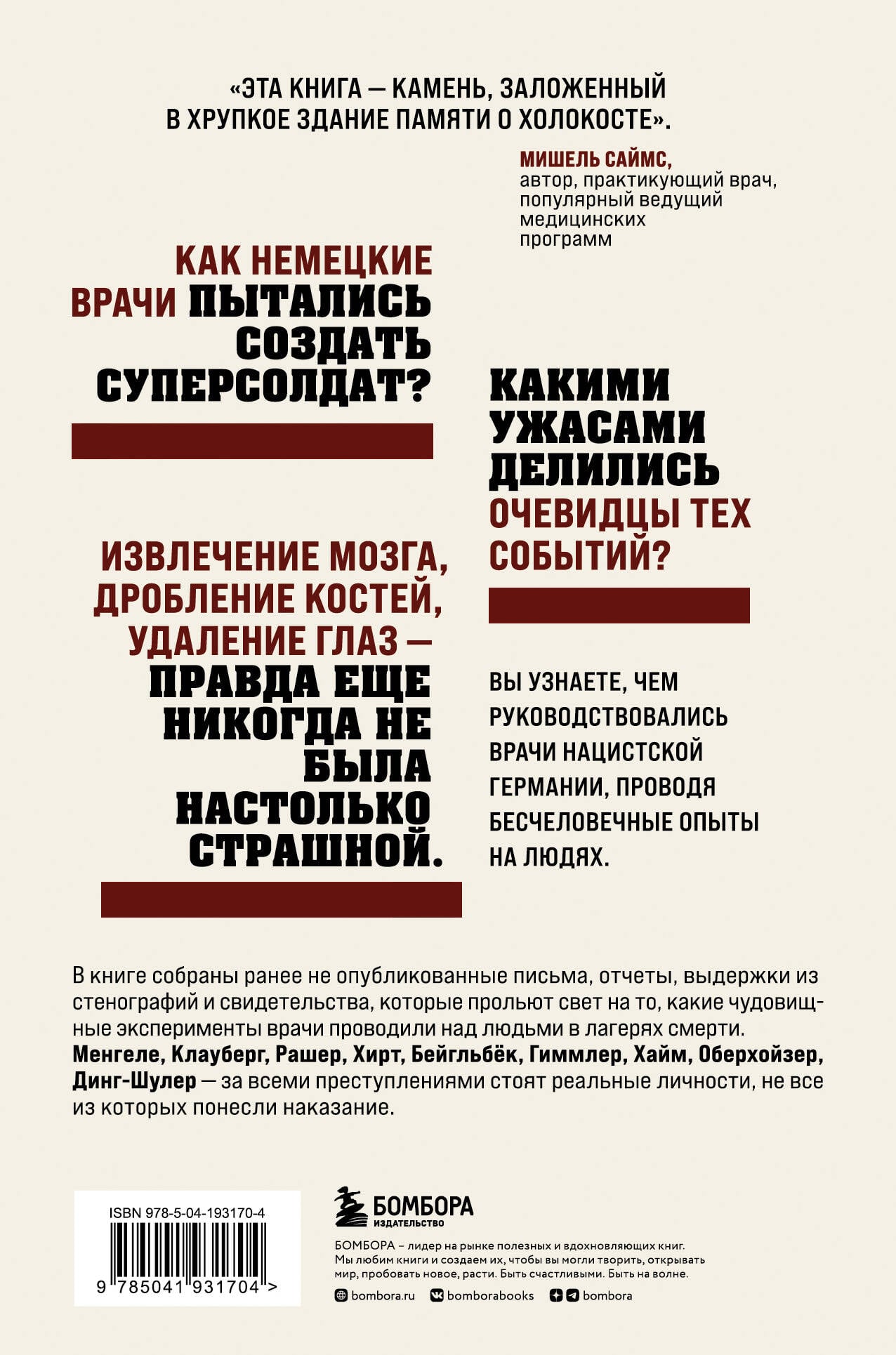 Ужасающие истории о тех, кто проводил эксперименты, заставляющие стынуть в жилах кровь. Мишель Саймс, практикующий врач и популярный ведущий медицинских программ, предоставляет доказательства этих бесчеловечных деяний, поименно называя тех, кто руководил, мучил, уничтожал. Менгеле, Клауберг, Рашер, Хирт, Бейгльбёк, Гиммлер, Хайм, Оберхойзер, Динг-Шулер - за всеми преступлениями стоят реальные личности, портреты которых нам мастерски точно рисует автор, показывая, что реальность порой хуже любого ночного кошмара.