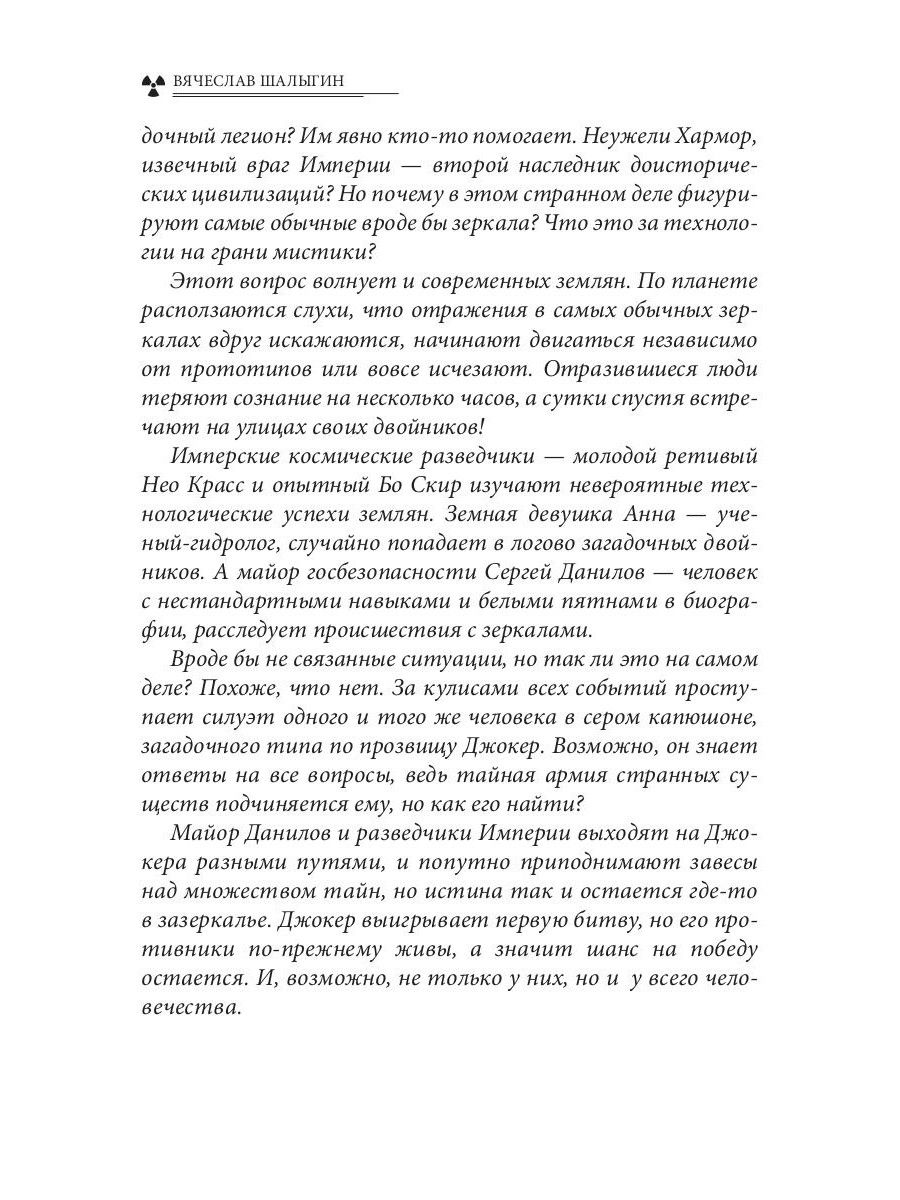 Много тысяч лет назад технологически развитая земная Империя создала портал, открывший людям путь в дальний космос. Побочным эффектом стало искажение времени и пространства, соединившее несколько параллельных реальностей. В наше время имперские космические странники решили вернуться на Землю, но очутились вовсе не в том мире, из которого улетали. Местные жители готовы дать отпор армаде космической Империи, и на их стороне выступают водяные - странные существа из еще одного соседнего мира. Майор госбезопасности Сергей Данилов - человек с нестандартными навыками и белыми пятнами в биографии, не верит в бескорыстность водяных, поэтому помогает имперским разведчикам выяснить, кто заманил их флот в ловушку и зачем. Дело оказывается настолько серьезным, что на стороне Данилова и разведчиков выступают даже шпионы космического Содружества Хармора - извечного врага Империи. Сборной команде бывших врагов предстоит основательно потрудиться, чтобы раскрыть планы водяных. Ведь иначе дело может закончиться войной во всех смежных реальностях, включая ту, в которой знают настоящую биографию «Данилова».| Издательство | Т8 RUGRAM |