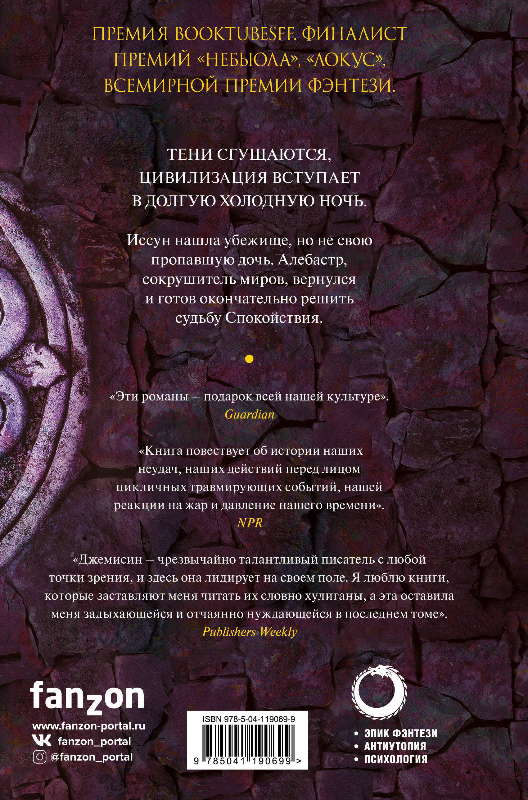 Спокойствие - мир циклических катастроф. Цивилизация уничтожается, а на ее обломках выжившие начинают строить новую, пока не грянет очередной конец света. Но будущий сезон Зимы продлится тысячелетия, и человечество может его не пережить. Возможный путь спасения - в руках людей, которые не заинтересованы в спасении мира. Избежит ли Спокойствие своей судьбы? Премия «Хьюго». Премия BooktubeSFF. Финалист премий «Небьюла», «Локус», «Всемирной премии фэнтези». «Эти романы - подарок всей нашей культуре». - Guardian «Удивительно». - Энн Леки «Джемисин повествует о истории наших неудач, наших действий перед лицом цикличных травмирующих событий, нашей реакции на жар и давление нашего времени. Ее достижения огромны». - NPR «Джемисин - чрезвычайно талантливый писатель с любой точки зрения, и здесь она лидирует на своем поле. Я люблю книги, которые заставляют меня читать их, словно хулиганы, а эта оставила меня задыхающейся и отчаянно нуждающейся в последнем томе». - Publishers Weekly «Замысловато и экстраординарно». - New York Times «Исключительно». - Library Journal «Потрясающе, снова». - Kirkus «Самая совершенная серия Джемисин». - RT Book Reviews «Как может что-то столь большое и сложное, как эта история, существовать в голове автора? Я не могу устоять, настолько влюблена в эту трилогию». - B&N| Издательство | ООО "Издательство "Эксмо" |