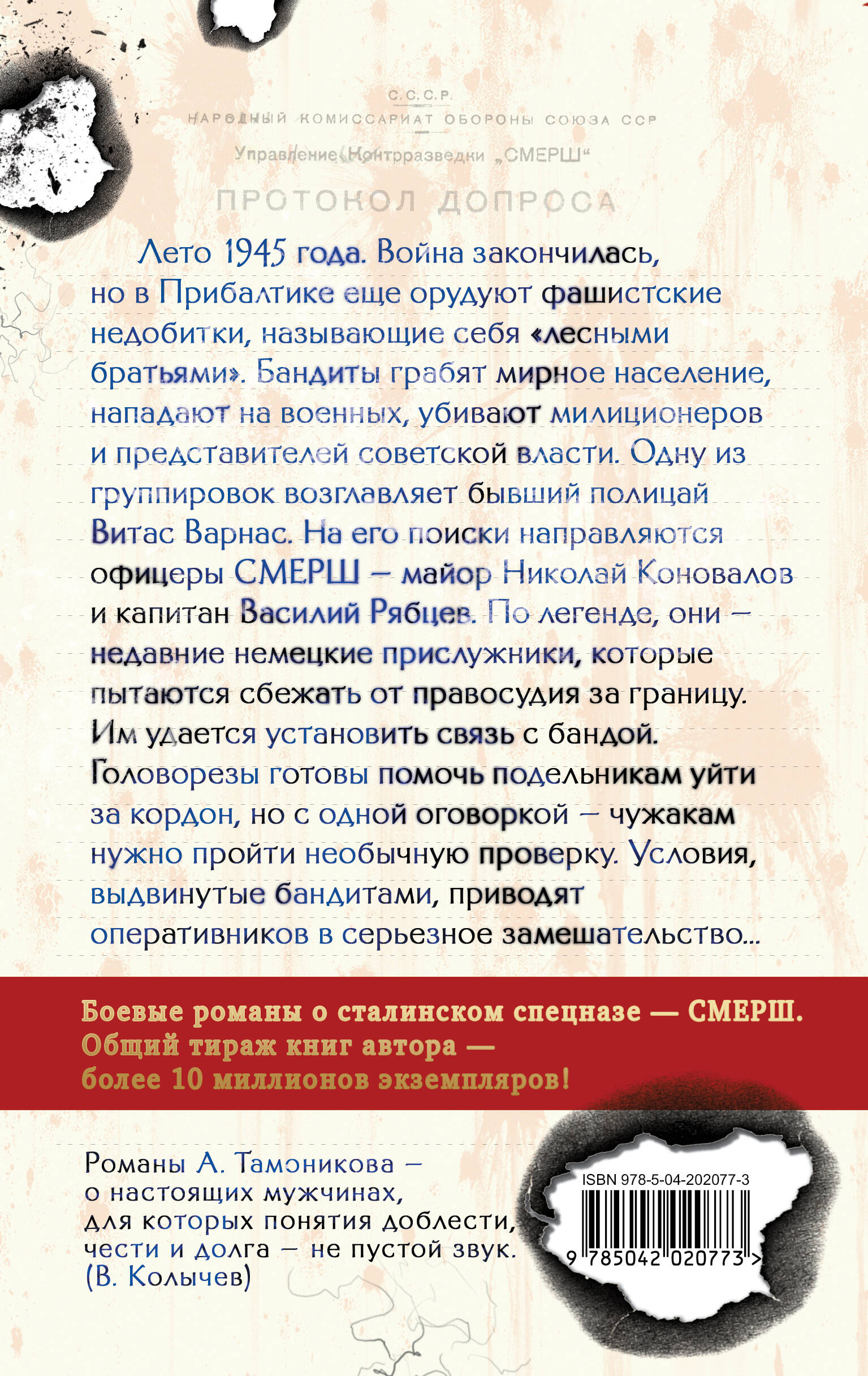 Самые интересные романы о сталинском спецназе - СМЕРШе. Лето 1945 года. Война закончилась, но в Прибалтике еще орудуют фашистские недобитки, называющие себя «лесными братьями». Бандиты грабят мирное население, нападают на военных, убивают милиционеров и представителей Советской власти. Одну из группировок возглавляет бывший полицай Витас Варнас. На его поиски направляются офицеры СМЕРШа - майор Николай Коновалов и капитан Василий Рябцев. По легенде они - недавние немецкие прислужники, которые пытаются сбежать от правосудия за границу. Им удается установить связь с бандой. Головорезы готовы помочь подельникам уйти за кордон, но с одной оговоркой: чужакам нужно пройти необычную проверку. Условия, выдвинутые бандитами, приводят оперативников в серьезное замешательство… «Смерть шпионам!» (СМЕРШ) - это короткое и беспощадное название носило особое подразделение НКВД, подчинявшееся И. Сталину. Созданное в годы войны, оно состояло из проверенных в бою, честных и бесстрашных офицеров Красной Армии. СМЕРШа боялись все - и фашистские лазутчики, готовящие диверсии в наших боевых порядках, и гитлеровские приспешники, действующие в глубоком советском тылу. Враг знал: если на его след напали бойцы сталинского спецназа, справедливого и скорого суда не избежать. Романы серии «СМЕРШ - спецназ Сталина» - это каждый раз увлекательный динамичный сюжет и новые исторические знания, это экшен, написанный простым и понятным языком. Общий тираж книг А. Тамоникова - более 10 миллионов экземпляров! ------------------------------ «Романы А. Тамоникова - о настоящих мужчинах, для которых понятия доблести, чести и долга - не пустой звук». - В. Колычев| Издательство | ООО "Издательство "Эксмо" |