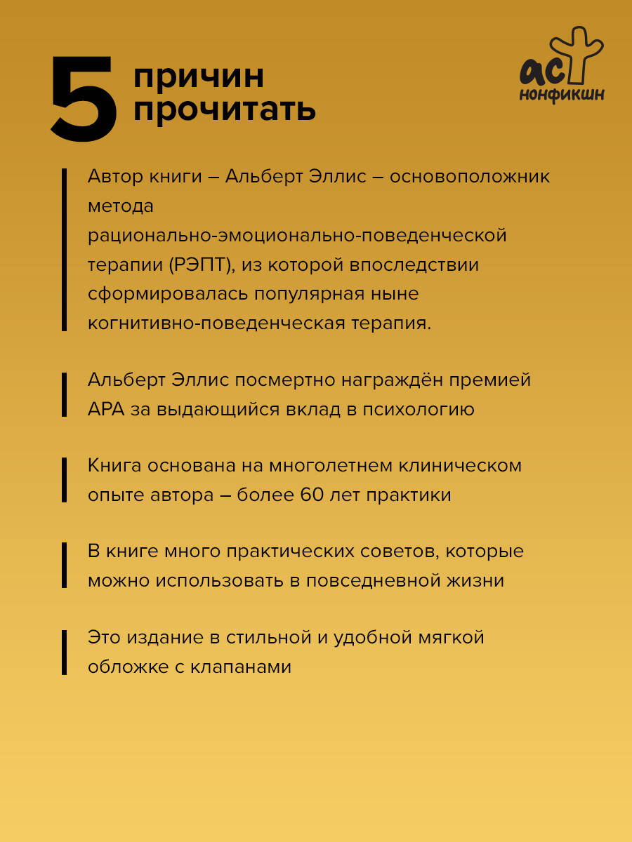 Самооценка - это зеркало, в котором мы видим себя, свои таланты и свой потенциал. Но что, если привычное "условное" оценивание, которое мы считаем путем к успеху, на самом деле ведет к провалу? Альберт Эллис (1913-2007) - доктор философии, американский психолог и когнитивный терапевт, более шестидесяти лет занимался психотерапией и консультированием по вопросам брака и семьи. Основоположник метода рационально-эмоционально-поведенческой терапии (РЭПТ), из которой впоследствии сформировалась популярная ныне когнитивно-поведенческая терапия. Автор более восьмидесяти книг, в том числе мировых научных бестселлеров. В книге автор предлагает эффективные упражнения и техники, которые помогают изменить деструктивные шаблоны мышления, эмоций и поведения. Вместо того чтобы постоянно оценивать - то положительно, то отрицательно - эти упражнения помогут принимать себя безусловно и выстроить фундамент для здоровых отношений с самим собой и с другими людьми. Эта книга поможет: • избавиться от тревожности и неуверенности в себе; • освободиться от гнета самокритики; • научиться принимать себя безусловно и безоценочно; • наладить отношения с окружающими и с самим собой; • сформировать здоровое отношение к удачам и неудачам.| Издательство | Издательство "АСТ" |