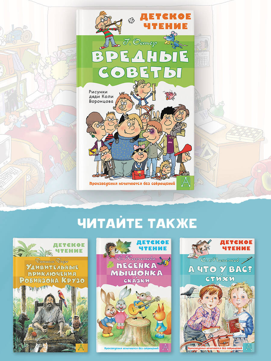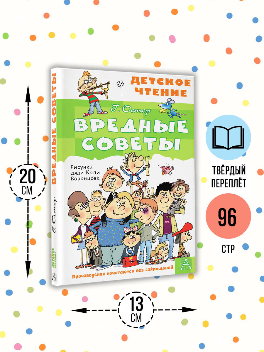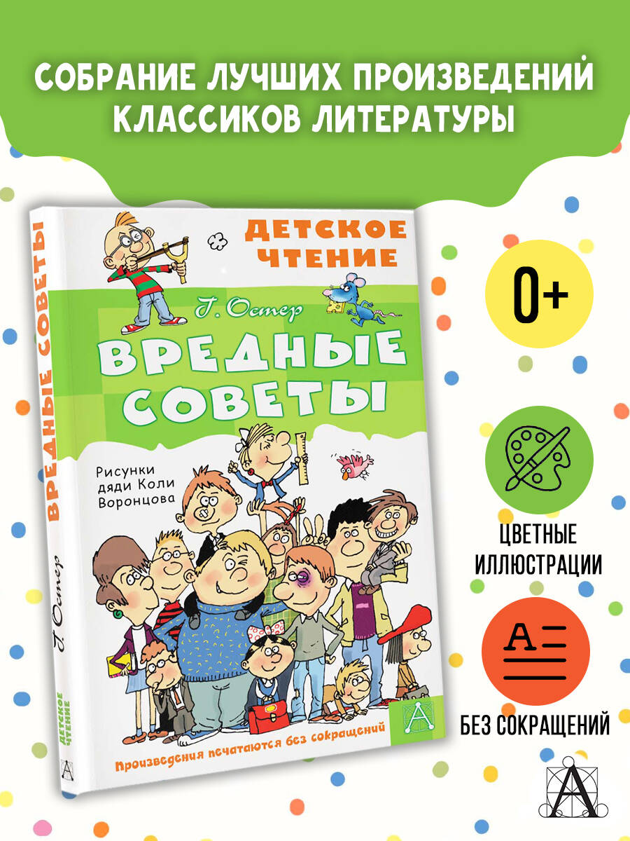ВРЕДНЫЕ СОВЕТЫ - особый жанр в детской литературе, придуманный писателем Григорием Остером. Каждое стихотворение обращено к ребёнку с якобы поощрением его безобразного поведения или хулиганских намерений. Детям, обладающим чувством юмора, такие подсказки помогают оценить собственные ошибки и заблуждения. В книгу вошли избранные вредные советы с иллюстрациями Николая Воронцова. Для среднего школьного возраста.| Издательство | АСТ |
