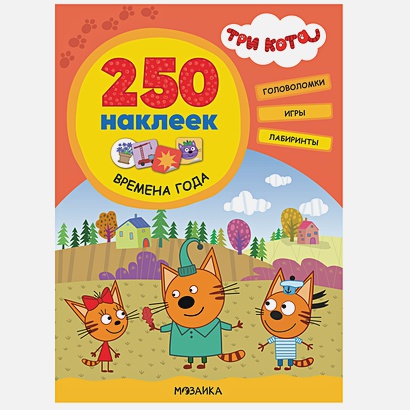 Времена года (Три кота. 250 наклеек) </p><p>Большой формат, много заданий и наклеек и любимые герои мультсериала «Три кота» - вот идеальное сочетание, которое надолго увлечет любого ребенка. На каждой странице книги «Времена года» серии «Три кота. 250 наклеек» ребенок найдет интересные задания на тему сезонных изменений; все их нужно будет решить с помощью наклеек. Пусть это не так просто, но очень увлекательно! А приклеив все 250 наклеек, можно проверить себя, в конце спрятаны ответы на все головоломки. Логика, внимание, память - всестороннее развитие мышления вместе с Коржиком, Карамелькой и Компотом. Миу-миу-миу!