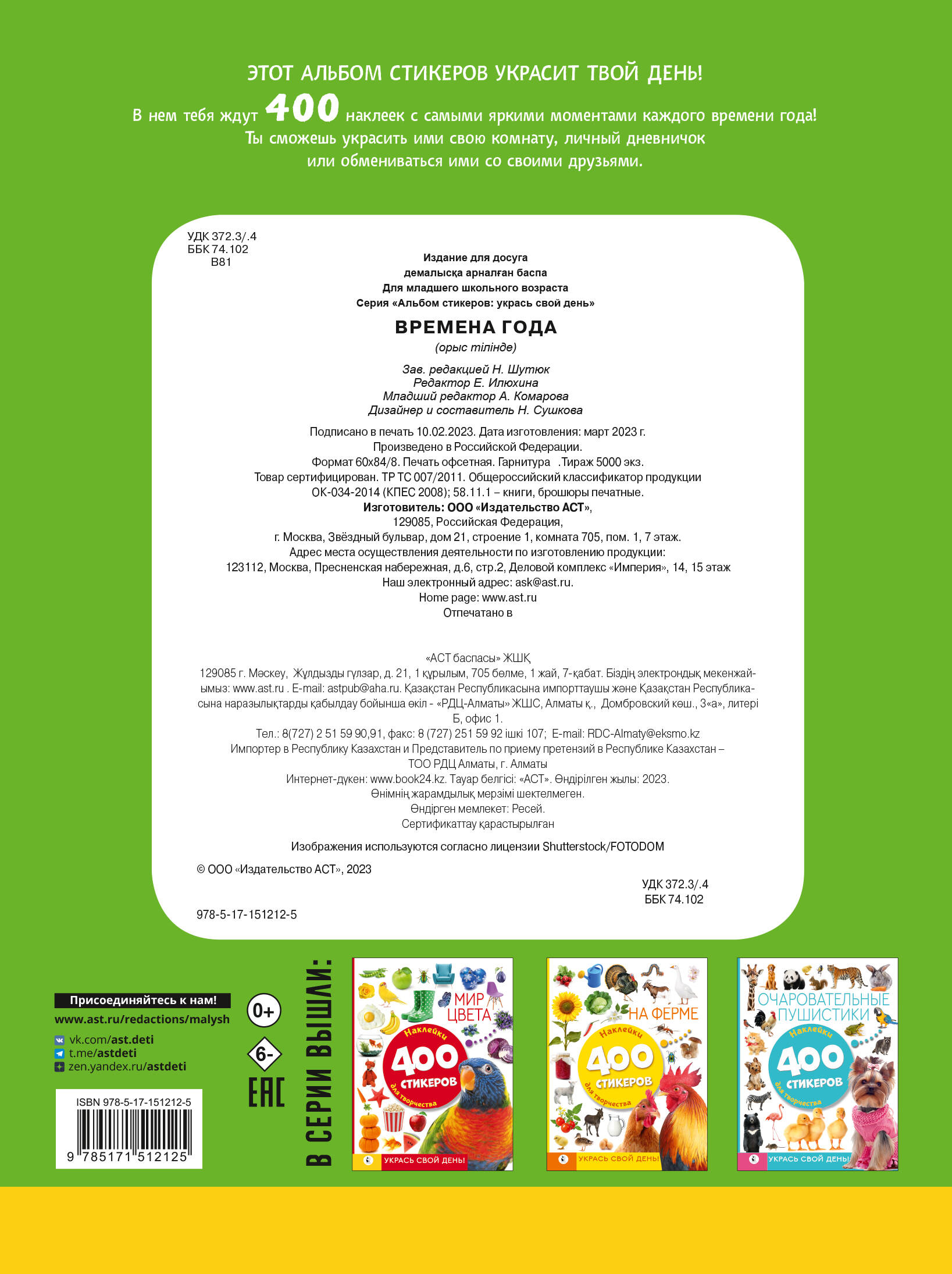 Этот альбом стикеров украсит твой день! В нем тебя ждут 400 наклеек с самыми яркими моментами каждого времени года! Ты сможешь украсить ими свою комнату, личный дневничок или обмениваться ими со своими друзьями.| Издательство | ИЗДАТЕЛЬСТВО "АСТ" |