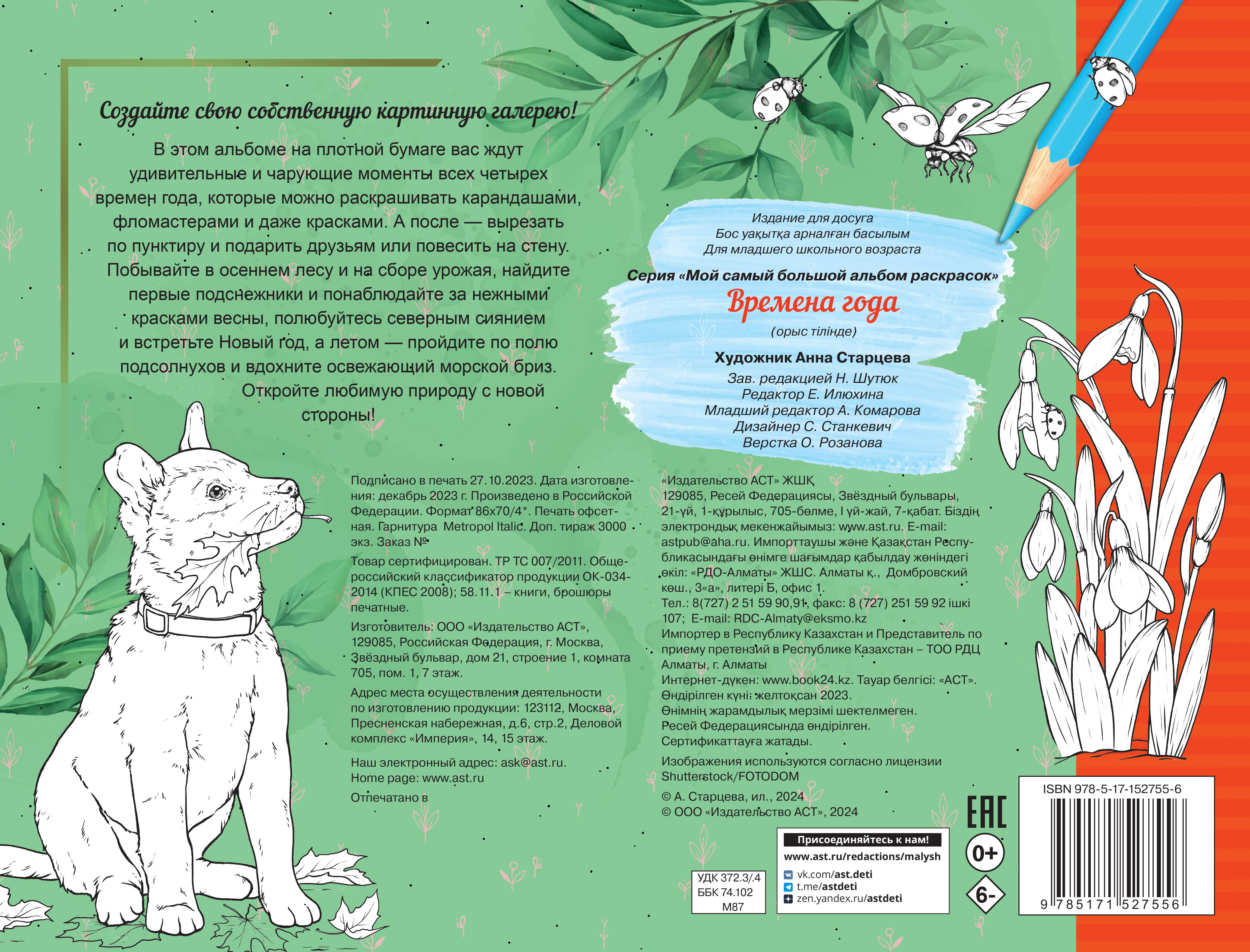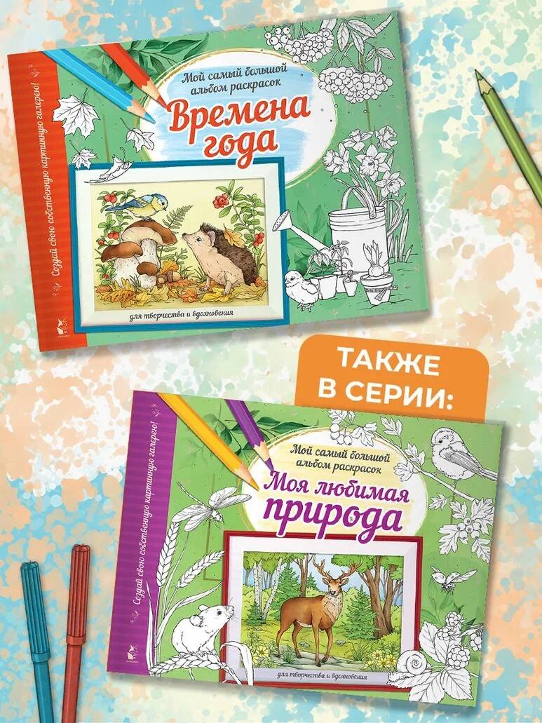 Создайте свою собственную картинную галерею! В этом альбоме на плотной бумаге вас ждут удивительные и чарующие моменты всех четырех времен года, которые можно раскрашивать карандашами, фломастерами и даже красками. А после - вырезать по пунктиру и подарить друзьям или повесить на стену. Побывайте в осеннем лесу и на сборе урожая, найдите первые подснежники и понаблюдайте за нежными красками весны, полюбуйтесь северным сиянием и встретьте Новый год, а летом - пройдите по полю подсолнухов и вдохните освежающий морской бриз. Откройте любимую природу с новой стороны!| Издательство | ИЗДАТЕЛЬСТВО "АСТ" |