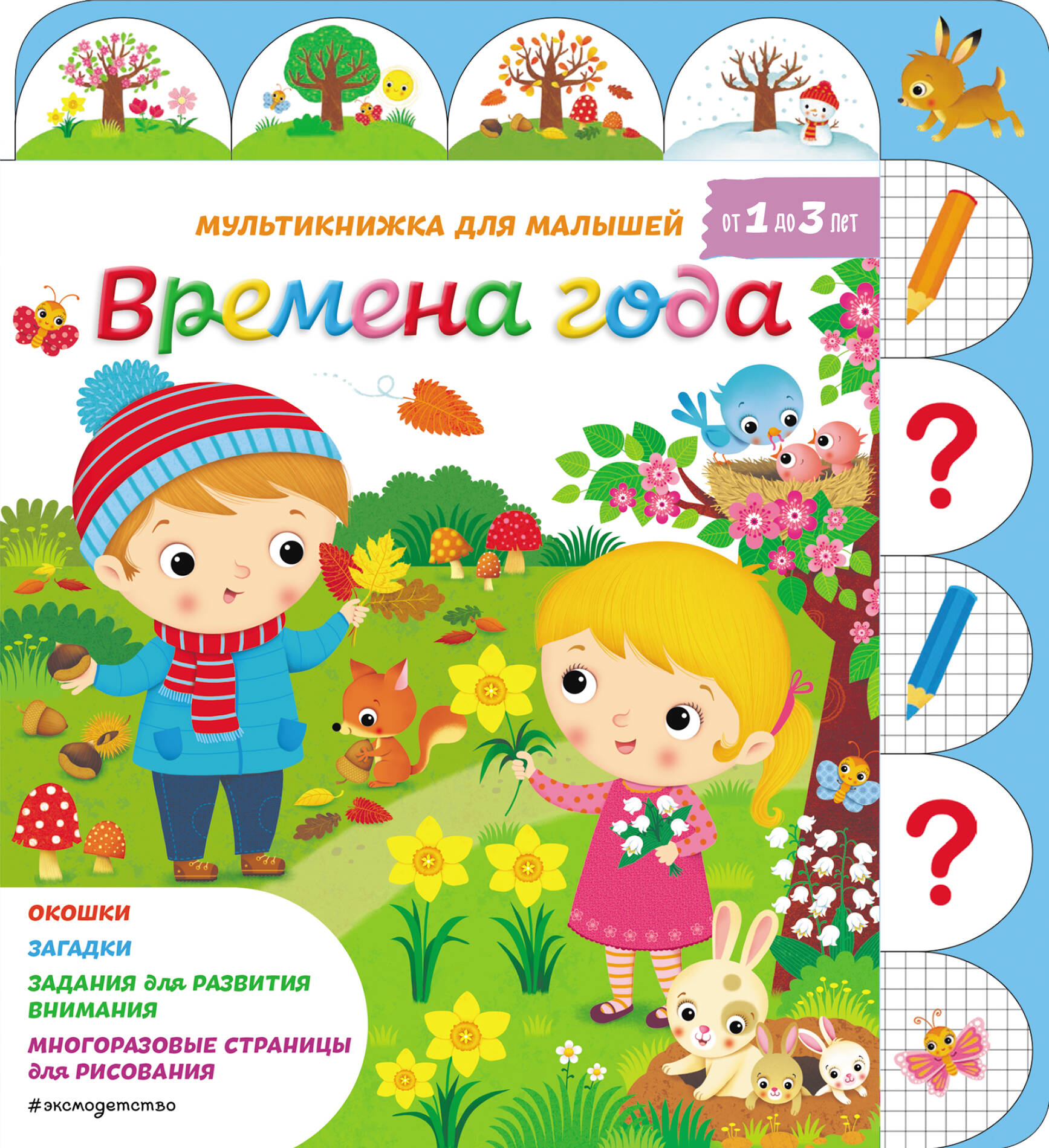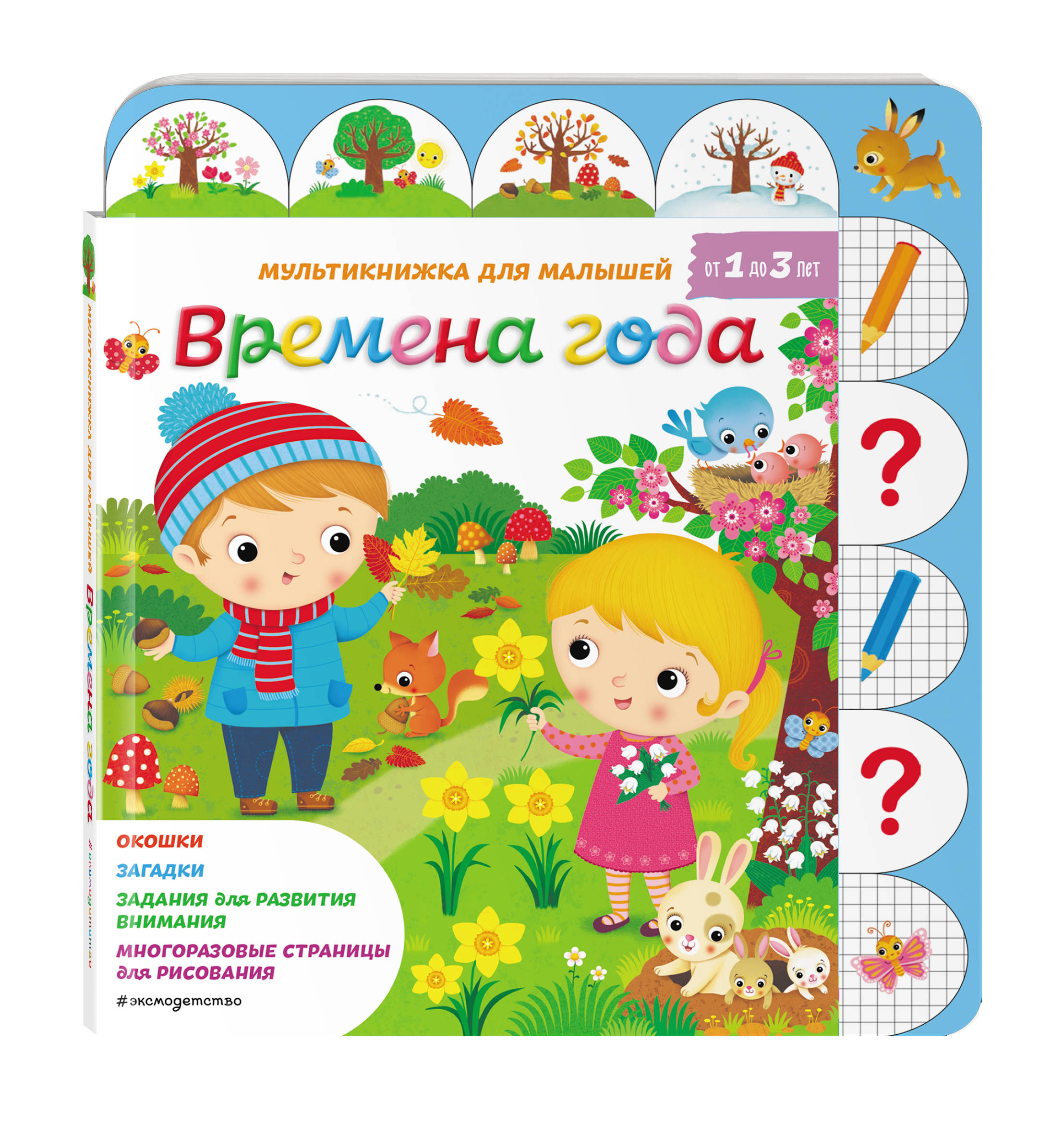 С помощью мультикнижки «Времена года» ваш малыш, играя, будет узнавать, как меняется природа и жизнь людей с приходом нового времени года. В ней вы найдете задания на развитие внимания, рифмованные загадки, окошки, под которыми спрятаны ответы на вопросы, а еще многоразовые страницы для рисования! Все нарисованное можно стереть влажной салфеткой и рисовать снова и снова. А выбрать задание помогут яркие индексы, ведущие на страницы книги.| Издательство | ООО "Издательство "Эксмо" |