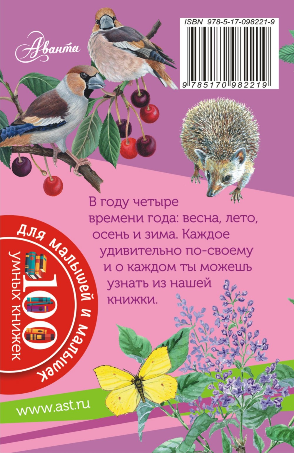 Из маленькой книжечки «Времена года» серии «100 умных книжек для малышей и малышек» известного биолога, натуралиста и популярного писателя А.В. Тихонова дети узнают очень много интересного: что происходит в лесу весной, летом, оченью и зимой, каждый месяц. Что едят рябчики зимой, как маленькие птички прогоняют хищную сову, когда у животных появляются детёныши, кто делает запасы и даже какая рыба любит лето, а какая - зиму.