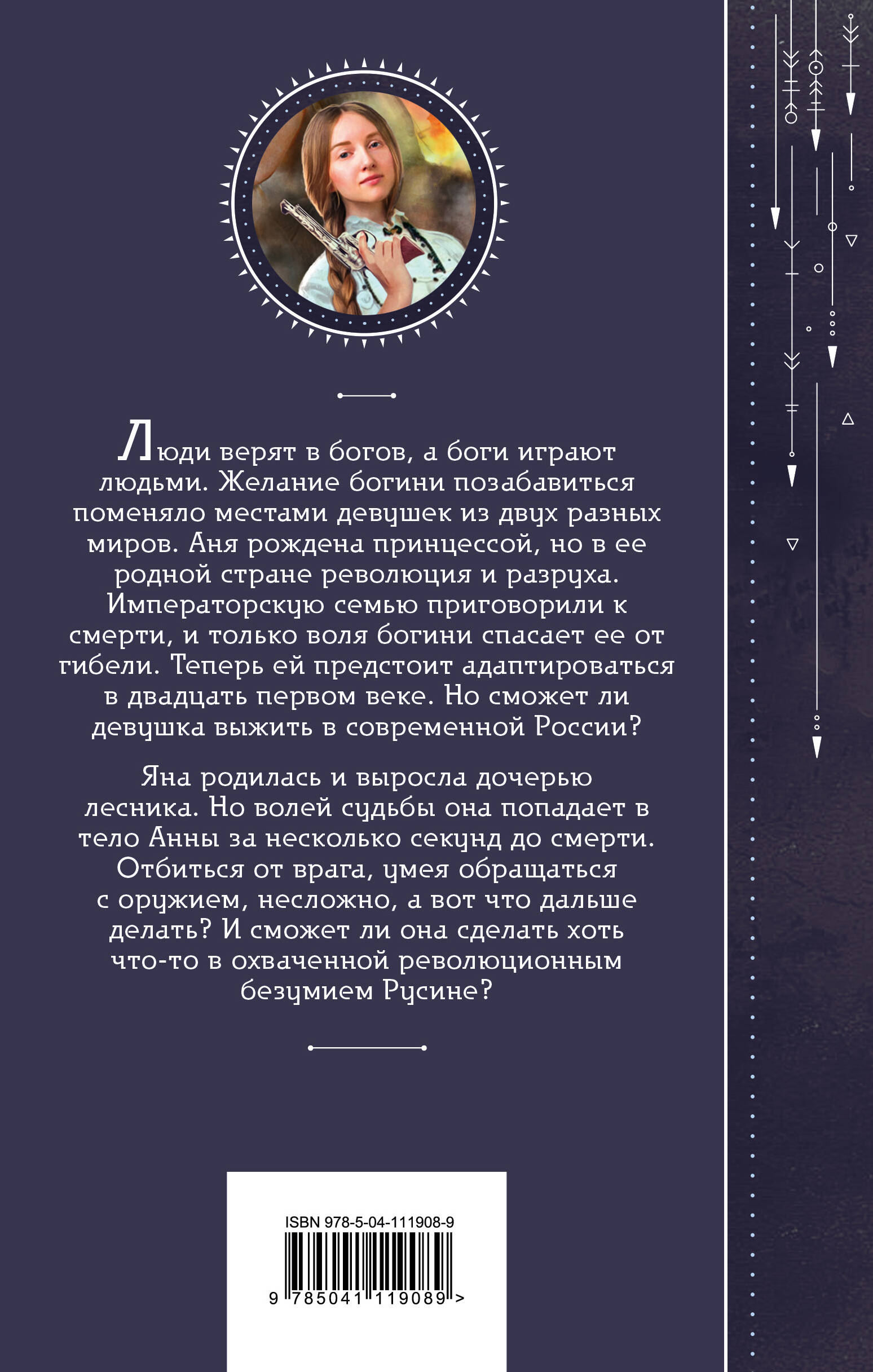 Люди верят в богов, а боги играют людьми. Желание богини позабавиться поменяло местами девушек из двух разных миров. Аня рождена принцессой, но в ее родной стране революция и разруха. Императорскую семью приговорили к смерти, и только воля богини спасает ее от гибели. Теперь ей предстоит адаптироваться в двадцать первом веке. Но сможет ли девушка выжить в современной России? Яна родилась и выросла дочерью лесника. Но волей судьбы она попадает в тело Анны за несколько секунд до смерти. Отбиться от врага, умея обращаться с оружием, несложно, а вот что дальше делать? И сможет ли она сделать хоть что-то в охваченной революционным безумием Русине?| Издательство | ООО "Издательство "Эксмо" |