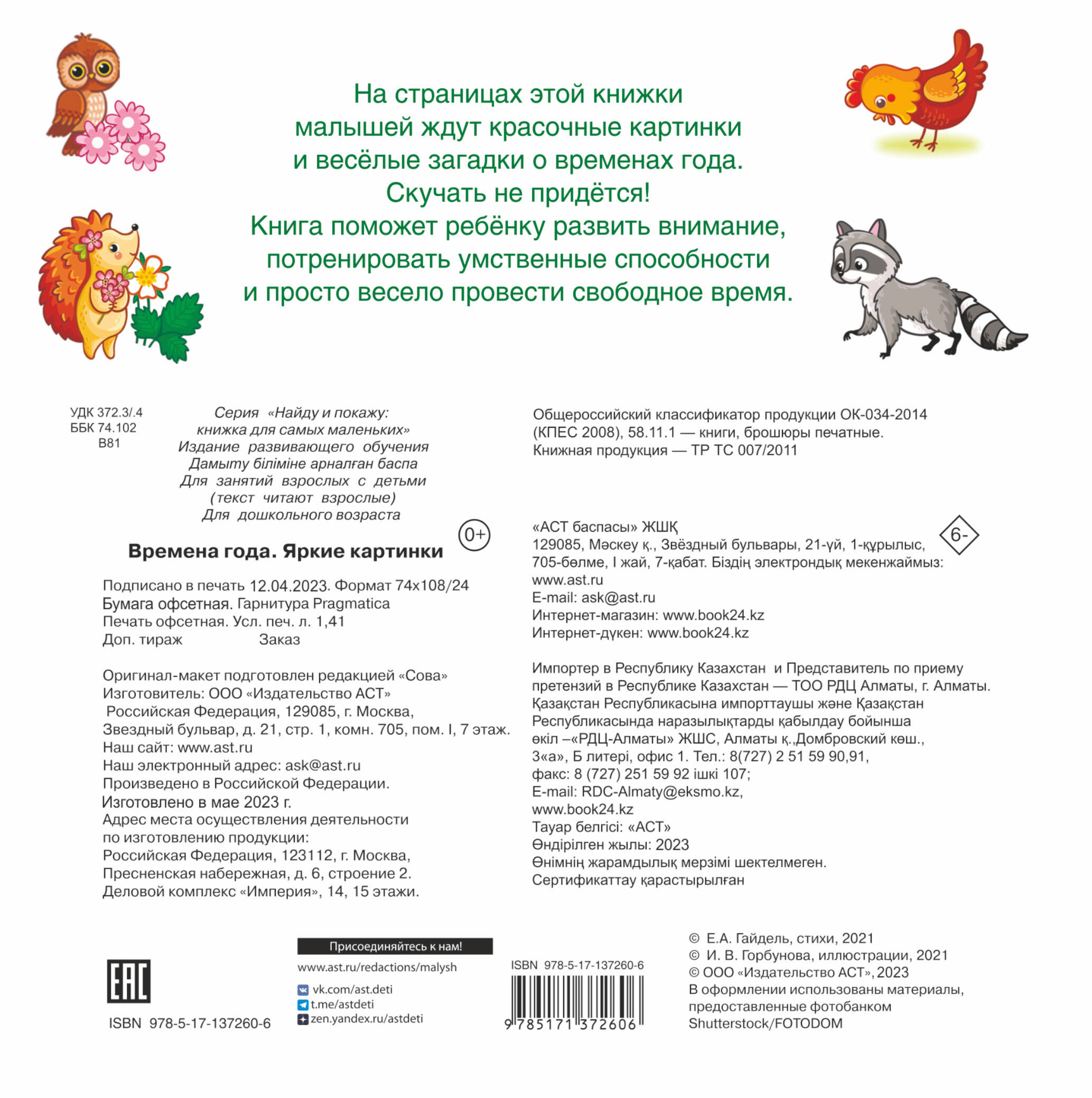 О чём эта книга Книжка «Времена года. Яркие картинки» поможет познакомить ребёнка с временами года. На её страницах малышу предлагаются занимательные задания. Находя и показывая картинки, ребёнок развивает внимание и наблюдательность, тренирует зрительную память и восприятие. Кому эта книга будет интересна Книга с заданиями для детей дошкольного возраста. Каковы особенности этой книги • 24 красочно иллюстрированные страницы с весёлыми заданиями. • Занятия по книге - приятное и полезное времяпровождение. • Увлекательные задания надолго займут малыша.| Издательство | ИЗДАТЕЛЬСТВО "АСТ" |