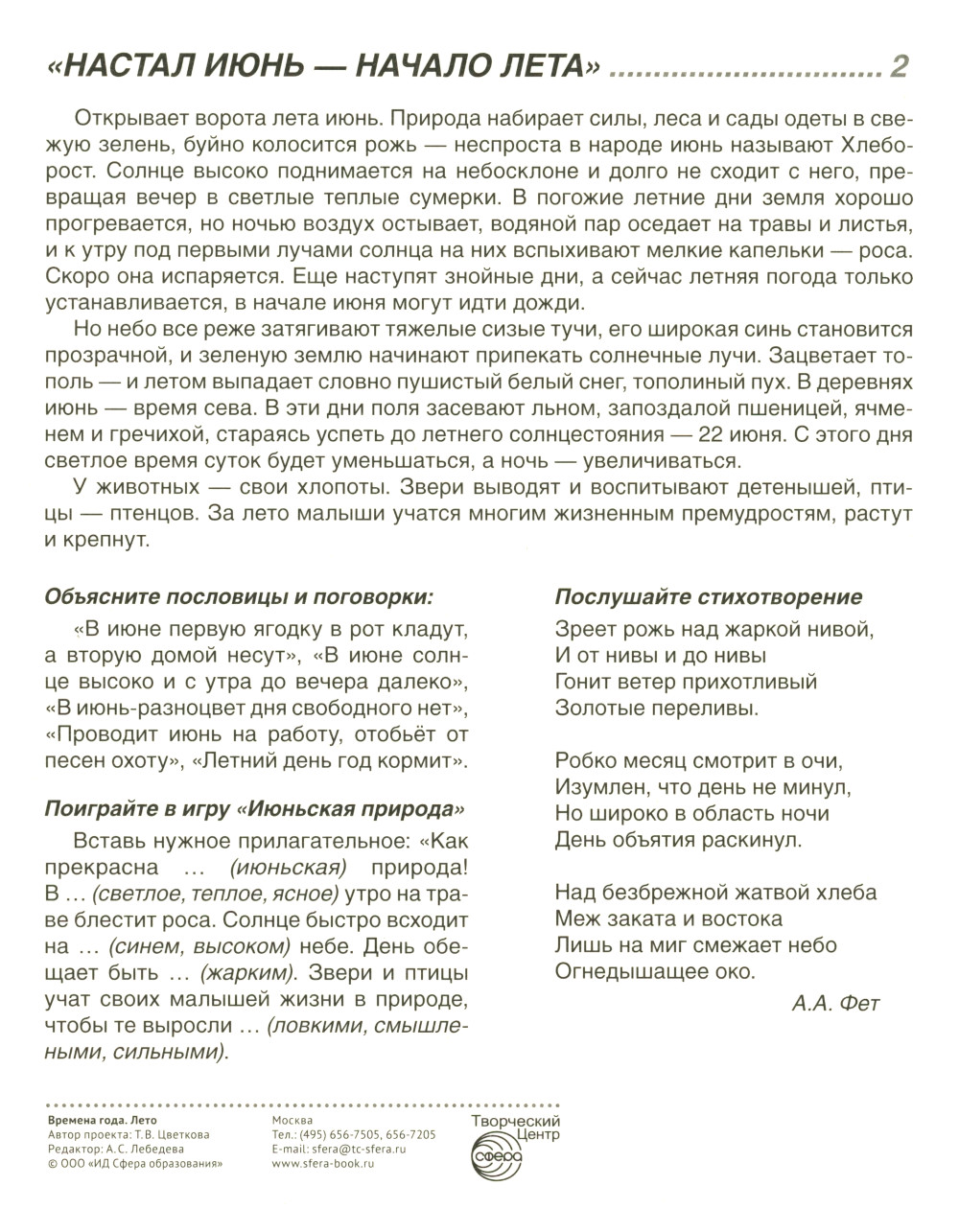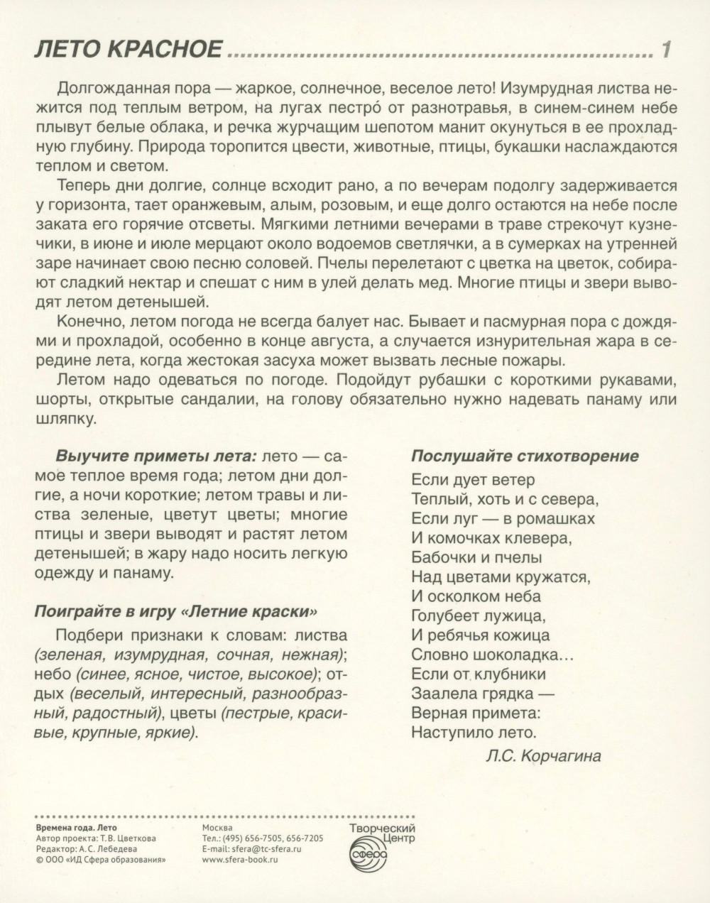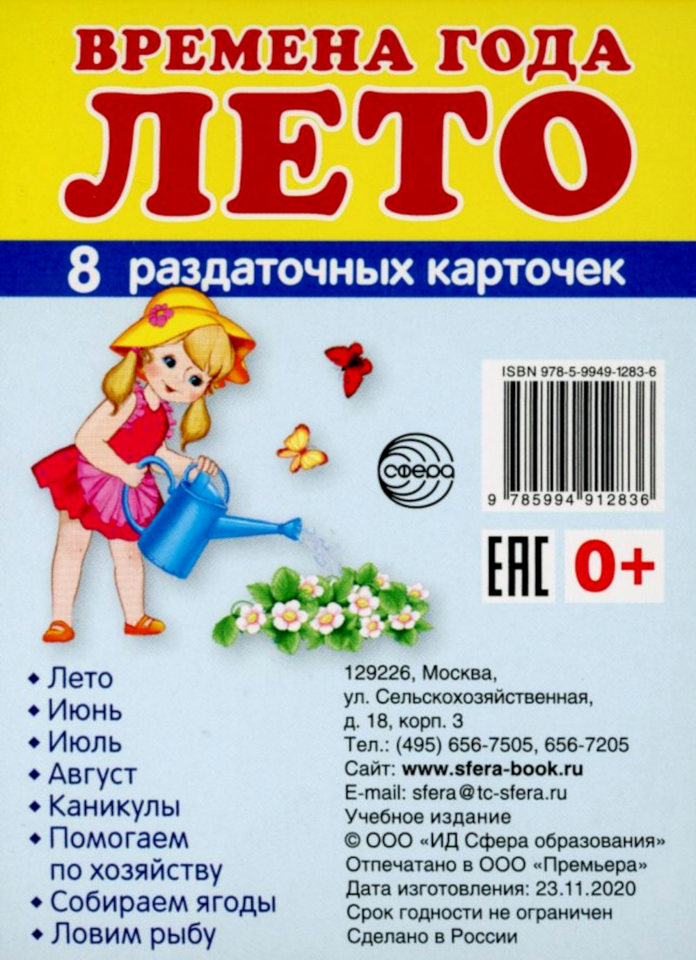 Комплект состоит из: Дем. картинки СУПЕР Времена года. Лето: 8 демонстр. картинок с текстом на обороте (17х22 см) Дем. картинки СУПЕР Времена года. Лето: 8 раздаточных карточек с текстом на обороте (63х87 мм) Комплект состоит из демонстрационных картинок размером 173х220 мм и раздаточных карточек размером 63х87 мм, предназначен для работы с дошкольниками и младшими школьниками на индивидуальных и групповых занятиях. На лицевой стороне каждой картинки дается цветное изображение с указанием темы, на обратной - краткое описание, стихотворение, загадка и вопросы по теме. Название каждой темы имеет перевод на английский язык и соответствующую транскрипцию. Материал излагается доступным для ребенка языком и целиком раскрывает тему. При использовании демонстрационных картинок в комплекте с раздаточными карточками, взрослый (педагог) сможет проводить занятие с демонстрационным материалом, а детям на стол положить раздаточные карточки. Подобная работа будет эффективна, поскольку предполагает обратную связь с ребенком.| Издательство | Творческий центр Сфера |