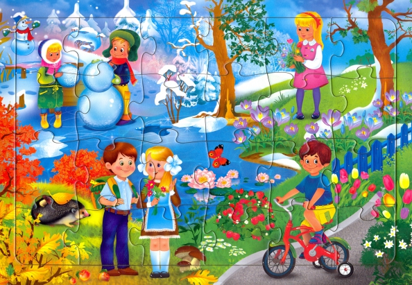 Пазл "Времена года" непременно понравится вашему ребенку. Собрав этот пазл, включающий в себя 24 картонных элемента, вы получите замечательную картину, на которой запечатлены все времена года. Пазл собирается на специальной картонной подложке. Элементы пазла достаточно крупные и идеально подойдут для самых маленьких.