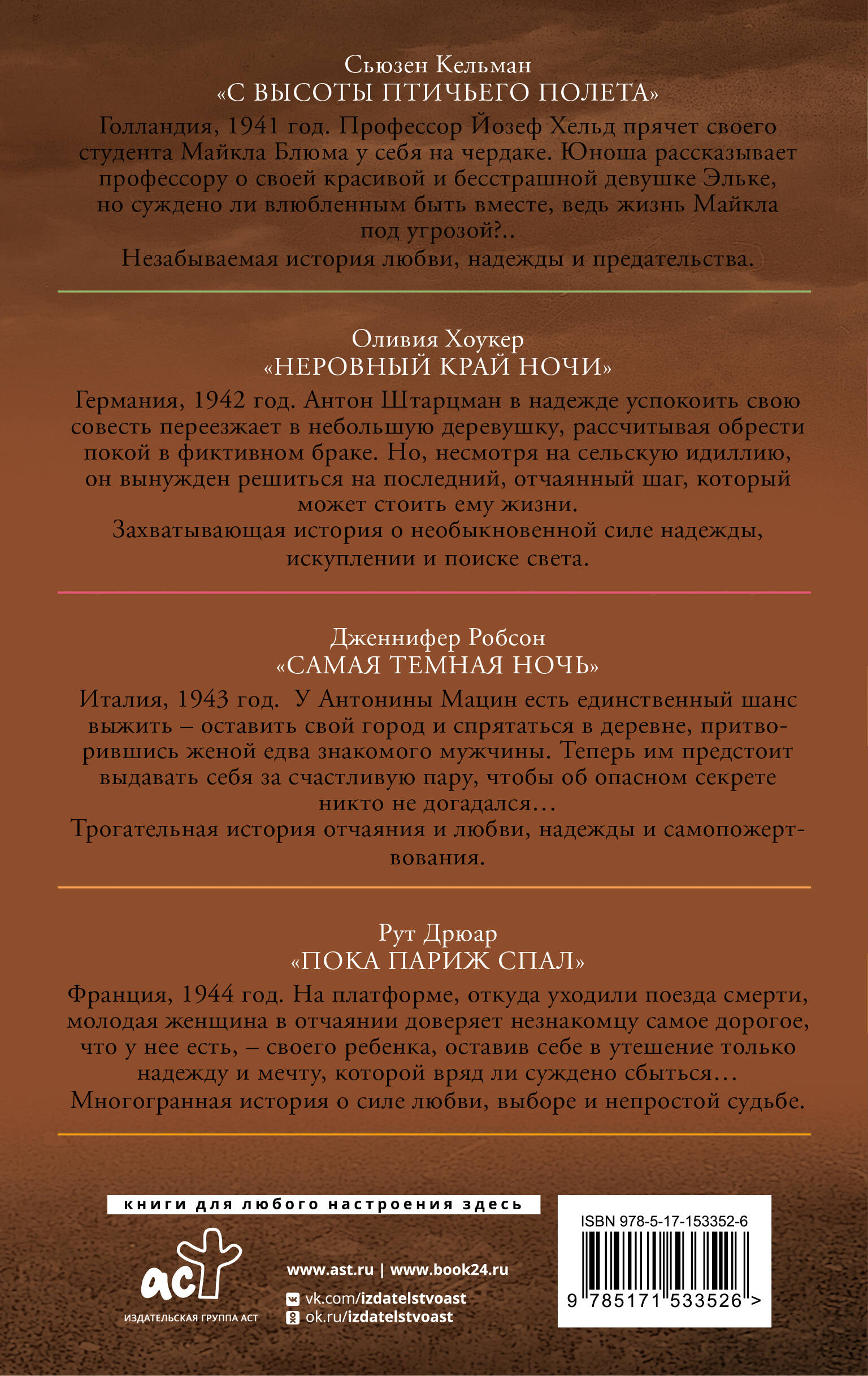 Сьюзен Кельман "С высоты птичьего полета" Голландия, 1941 год. Профессор Йозеф Хельд прячет своего студента Майкла Блюма у себя на чердаке. Юноша рассказывает профессору о своей красивой и бесстрашной девушке Эльке, но суждено ли влюбленным быть вместе, ведь жизнь Майкла под угрозой?.. Незабываемая история любви, надежды и предательства. Оливия Хоукер "Неровный край ночи" Германия, 1942 год. Антон Штарцман в надежде успокоить свою совесть переезжает в небольшую деревушку, рассчитывая обрести покой в фиктивном браке. Но, несмотря на сельскую идиллию, он вынужден решиться на последний, отчаянный шаг, который может стоить ему жизни. Захватывающая история о необыкновенной силе надежды, искуплении и поиске света. Дженнифер Робсон "Самая темная ночь" Италия, 1943 год. У Антонины Мацин есть единственный шанс выжить - оставить свой город и спрятаться в деревне, притворившись женой едва знакомого мужчины. Теперь им предстоит выдавать себя за счастливую пару, чтобы об опасном секрете никто не догадался… Трогательная история отчаяния и любви, надежды и самопожертвования. Рут Дрюар "Пока Париж спал" Франция, 1944 год. На платформе, откуда уходили поезда смерти, молодая женщина в отчаянии доверяет незнакомцу самое дорогое, что у нее есть, - своего ребенка, оставив себе в утешение только надежду и мечту, которой вряд ли суждено сбыться… Многогранная история о силе любви, выборе и непростой судьбе.| Издательство | ИЗДАТЕЛЬСТВО "АСТ" |