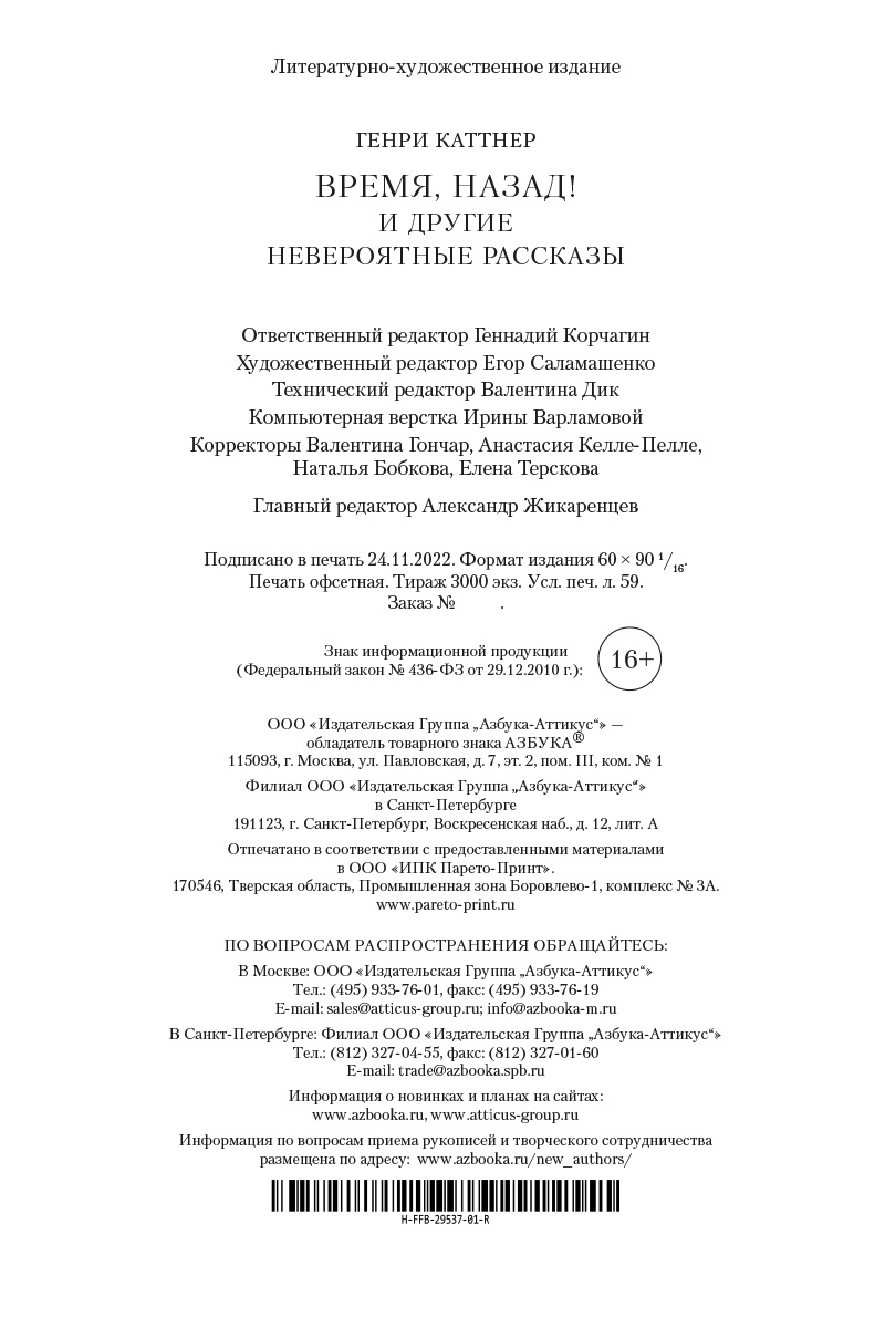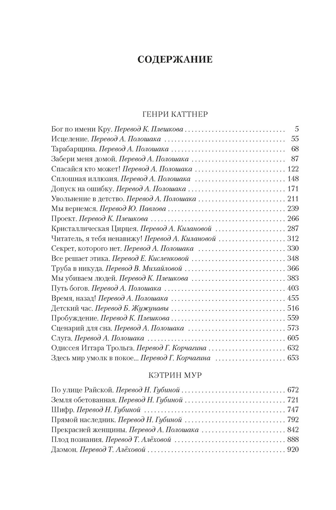 Генри Каттнер, публиковавшийся не только под своей настоящей фамилией, но и под доброй дюжиной псевдонимов, считается одним из четырех или пяти ведущих американских фантастов 1940-х. Легендарные жанровые журналы, такие как «Future», «Thrilling Wonder», «Planet Stories» и «Weird Tales», более чем охотно принимали произведения, написанные им самостоятельно или в соавторстве с женой, известным мастером фантастики и фэнтези Кэтрин Люсиль Мур; бывало, что целый выпуск журнала отводился для творчества Каттнера. Почти все, созданное этим автором, имеет оттенок гениальности, но особенно удавалась ему «малая литературная форма»: рассказы о мутантах Хогбенах, о чудаковатом изобретателе Гэллегере и многие другие, сдобренные неподражаемым юмором, нескольким поколениям читателей привили стойкую любовь к фантастике. Почти все произведения, вошедшие в этот сборник, публикуются на русском языке впервые или в новом переводе. Повести «Бог по имени Кру» и «Детский час» удостоены премии «Хьюго».| Издательство | Азбука |