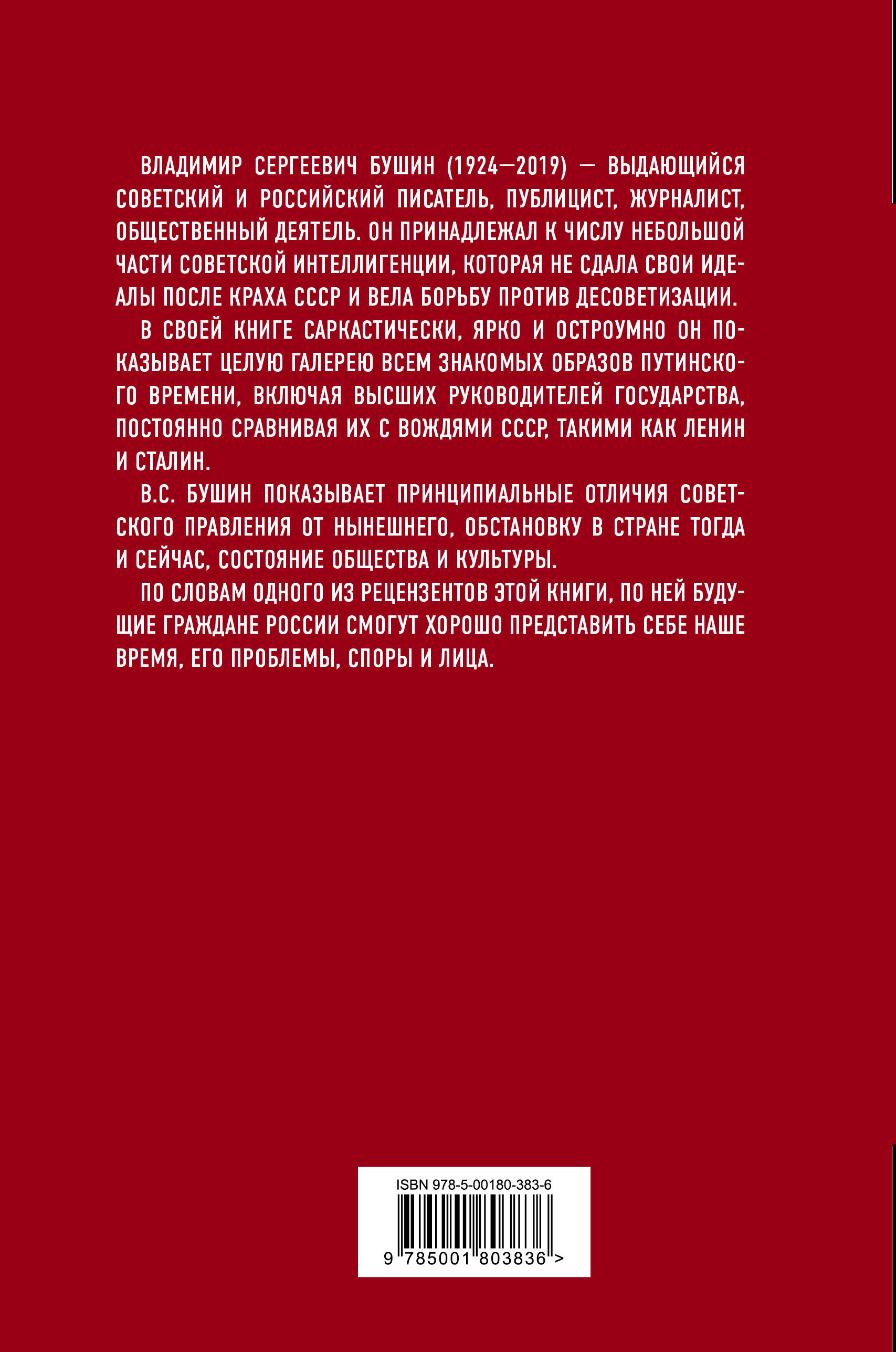 Владимир Сергеевич Бушин (1924-2019) - выдающийся советский и российский писатель, публицист, журналист, общественный деятель. Он принадлежал к числу небольшой части советской интеллигенции, которая не сдала свои идеалы после краха СССР и вела борьбу против десоветизации. В своей книге саркастически, ярко и остроумно он показывает целую галерею всем знакомых образов путинского времени, включая высших руководителей государства. Постоянно сравнивая их с вождями СССР, такими как Ленин и Сталин, В.С. Бушин показывает принципиальные отличия советского правления от нынешнего, обстановку в стране тогда и сейчас, состояние общества и культуры. По словам одного из рецензентов этой книги, по ней будущие граждане России смогут хорошо представить себе наше время, его проблемы, споры и лица.| Издательство | Родина Издательство ООО |