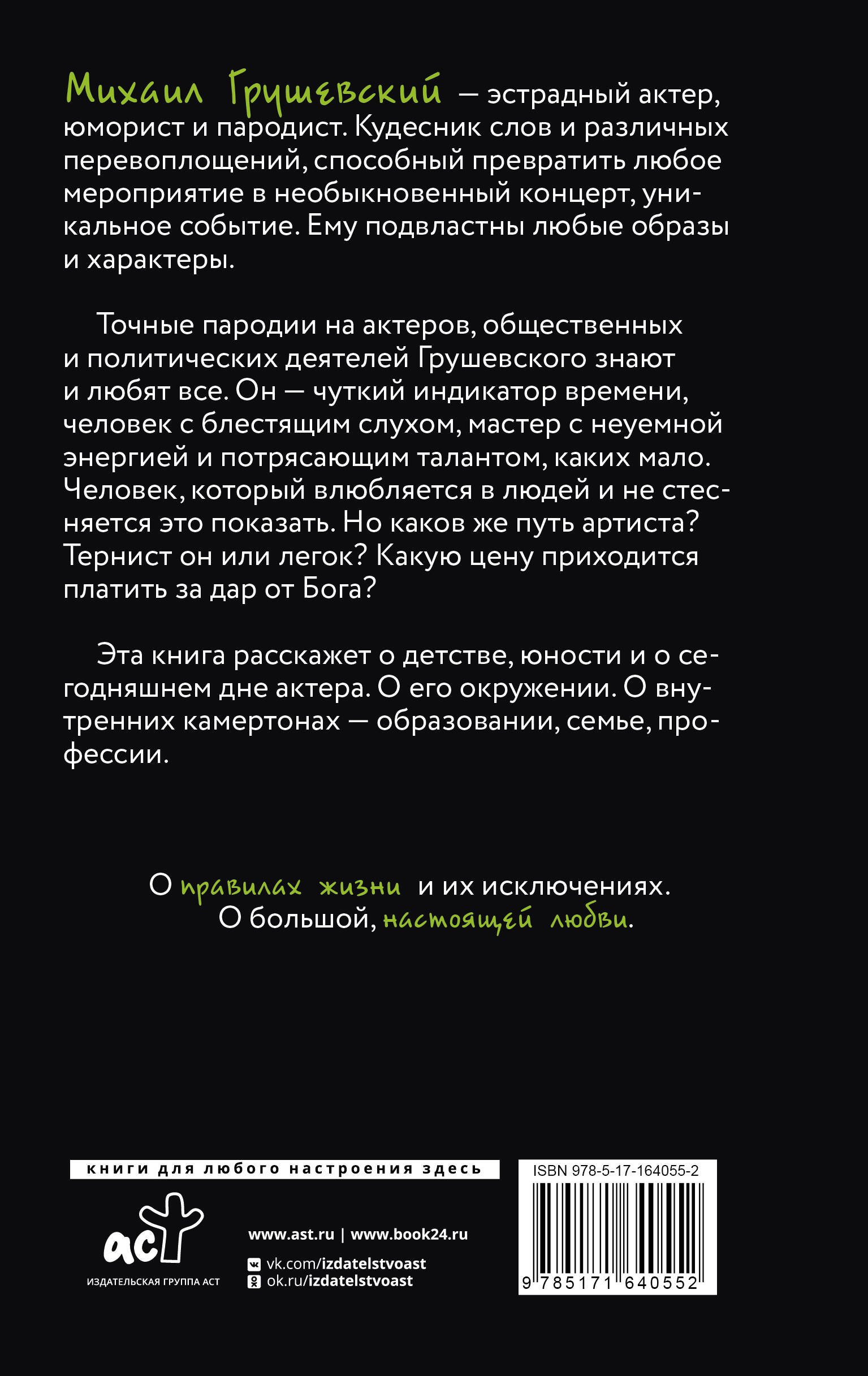 Михаил Грушевский - эстрадный актер, юморист и пародист. Кудесник словоформ и различных перевоплощений, способный превратить любое мероприятие в необыкновенный концерт, уникальное событие. Ему подвластны любые образы и характеры. Точные пародии на актеров, общественных и политических деятелей Грушевского знают и любят все. Он - чуткий индикатор времени, человек с блестящим слухом, мастер с неуемной энергией и потрясающим талантом, каких мало. Человек, который влюбляется в людей и не стесняется это показать. Но каков же путь артиста? Тернист он или легок? Какую цену приходится платить за дар от Бога? Эта книга расскажет о детстве, юности и о сегодняшнем дне актера. О его окружении. О внутренних камертонах - образовании, семье, профессии. О правилах жизни и их исключениях. О большой, настоящей любви.| Издательство | Издательство "АСТ" |
