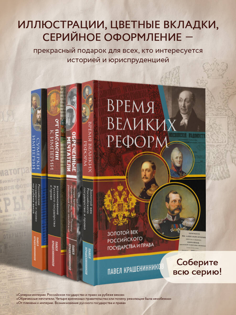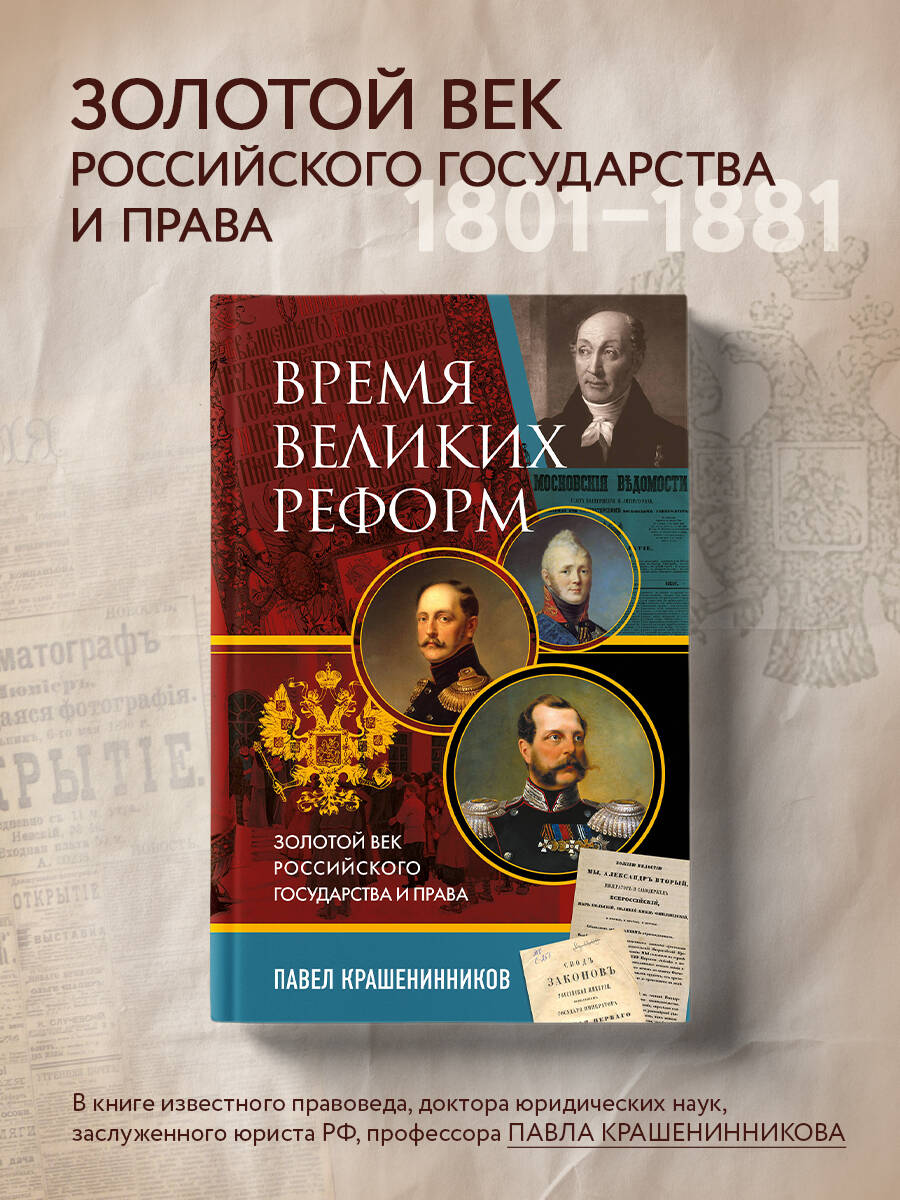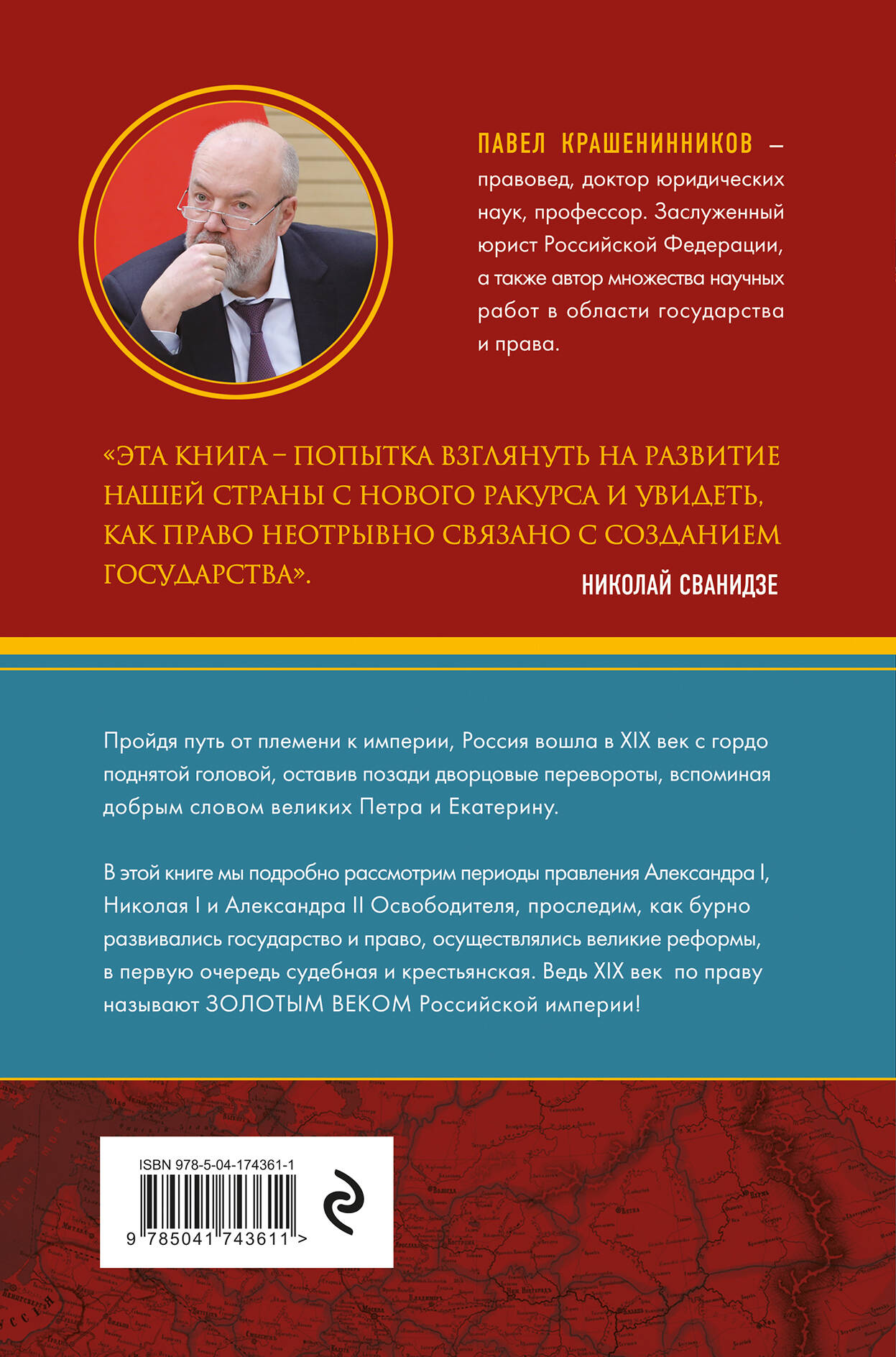 Пережив потрясения XVIII века, века дворцовых переворотов, Россия вошла в XIX век, готовая к грядущим переменам. Российские императоры активно проводили реформы внутри страны и становились ключевыми игроками на международной арене. Триумфальный XIX век стал для России эпохой судьбоносных событий, великих побед и решительных реформ, подготовивших расцвет огромной империи. Книга известного российского правоведа, доктора юридических наук, профессора Павла Крашенинникова «Время великих реформ. Золотой век российского государства и права» охватывает период со вступления на престол императора Александра I в 1801 году до начала правления императора Александра III в 1881 году. Издание является продолжением книги «От племени к империи. Возникновение русского государства и права» и познакомит читателя с насыщенным событиями XIX веком с точки зрения развития государства и права. Как работал государственный механизм, как принимались и действовали законодательные акты, как подготавливались и осуществлялись Великие реформы, в первую очередь крестьянская и судебная, - на эти и многие другие вопросы вы найдете ответ в этой книге и поймете, почему эти 80 лет называют Золотым веком государства и права в России. Если вам интересна история России, история государства и права, если вы хотите научиться видеть взаимосвязь между развитием юриспруденции и укреплением государственности, это издание станет неоценимым вкладом в вашу читательскую библиотеку.| Издательство | ООО "Издательство "Эксмо" |