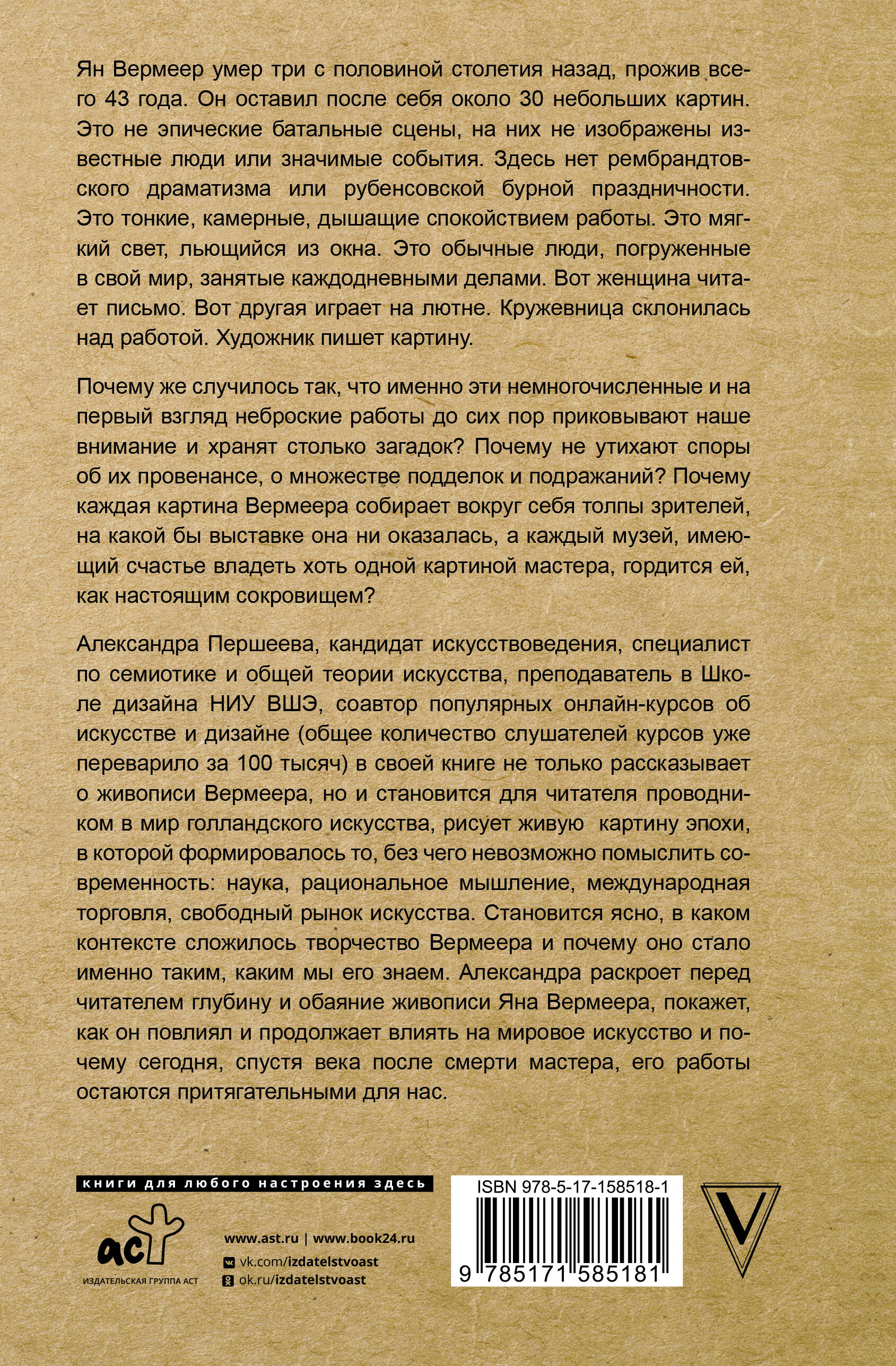 Ян Вермеер умер три с половиной столетия назад, прожив всего 43 года. Он оставил после себя около 30 небольших картин. Это не эпипческие батальные сцены, на них не изображены известные люди или значимые события. Здесь нет рембрандтовского драматизма или рубенсовской бурной праздничности. Это тонкие, камерные, дышащие спокойствием работы. Это мягкий свет, льющийся из окна. Это обычные людим, погруженные в свой мир, занятые каждодневными делами. Вот женщина читает письмо. Вот другая играет на лютне. Кружевница склонилась над работой. Художник пишет картину. Почему же случилось так, что именно эти немногочисленные и на первый взгляд неброские работы до сих пор приковывают наше внимание и хранят столько загадок? Почему не утихают споры об их провенансе, о множестве подделок и подражаний? Почему каждая картина Вермеера собирает вокруг себя толпы зрителей, на какой бы выставке она ни оказалась, а каждый музей, имеющий счастье владеть хоть одной картиной мастера, гордится ей, как настоящим сокровищем? Александра Першеева, кандидат искусствоведения, специалист по семиотике и общей теории искусства, преподаватель в Школе дизайна НИУ ВШЭ, соавтор популярных онлайн-курсом об искусстве и дизайне (общее количество слушателей курсов уже переварило за 100 тысяч) в своей книге не только рассказывает о живописе Вермеера, но и становится для читателя проводником в мир голландского искусства, рисует живую картину эпохи, в которой сформировалось то, без чего невозможно помыслить современность: наука, рациональное мышление, международная торговля, свчободный рынок искусства. Становится ясно, в каком контексте сложилось творчество Вермеера и почему оно стало именно таким, каким мы его знаем. Александра раскроет перед читателем глубину и обаяние живописи Яна Вермеера, покажет, как он повлиял и продолжает влиять на мировое искусство и почему сегодня, спустя века после смерти мастера, его работы остаются притягаительными для нас.| Издательство | ИЗДАТЕЛЬСТВО "АСТ" |
