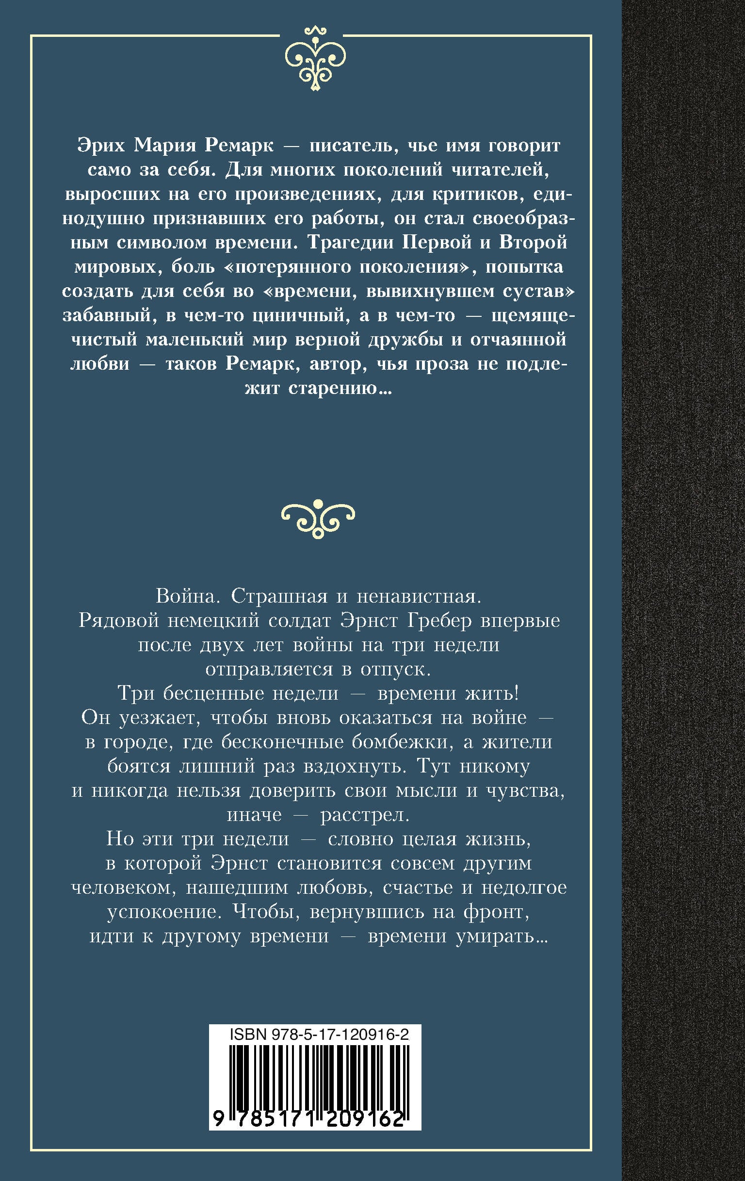 Война. Страшная и ненавистная. Рядовой немецкий солдат Эрнст Гребер впервые после двух лет войны на три недели отправляется в отпуск. Три бесценные недели - времени жить! Он уезжает, чтобы вновь оказаться на войне - в городе, где бесконечные бомбежки, а жители боятся лишний раз вздохнуть. Тут никому и никогда нельзя доверить свои мысли и чувства, иначе - расстрел. Но эти три недели, словно целая жизнь, в которой Эрнст становится совсем другим человеком, нашедшим любовь, счастье и недолгое успокоение. Чтобы, вернувшись на фронт, идти к другому времени - времени умирать…| Издательство | ИЗДАТЕЛЬСТВО "АСТ" |