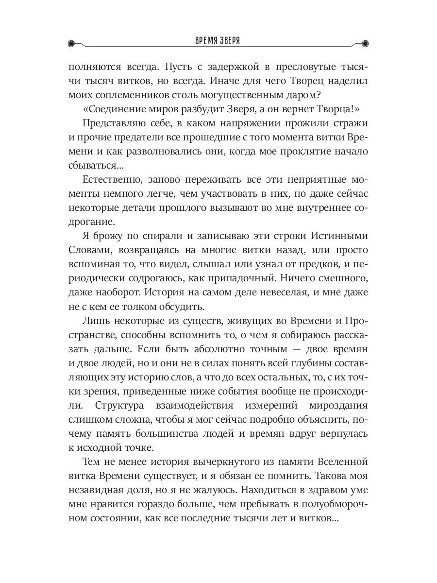 Кто сказал, что жизнь есть только в нашем пространстве. Почему ее не может быть где-то во времени? Как это? А давайте представим, что Время это своего рода спиральное пространство по которому можно перемещаться и в котором есть обитатели. А дальше представим, что между нашим миром и трехмерным Временем вдруг образовался портал. По нашей вине. Как могли бы отреагировать времяне? Пожурить, понять и простить? Возможно. Вот только из-за нашего портала из Времени сбежал особо опасный Зверь. Сбежал, понятное дело, к нам. И если мы его не найдем и не выдадим времянам, они спустятся со своей спирали и устроят охоту на Зверя сами. И тут уж, люди, извините, охота будет похожа на геноцид. Времяне будут действовать наверняка - уничтожать всех подряд. Ведь Зверь из Времени обязательно натянет самую удобную для себя маску - человеческую.| Издательство | Т8 RUGRAM |
