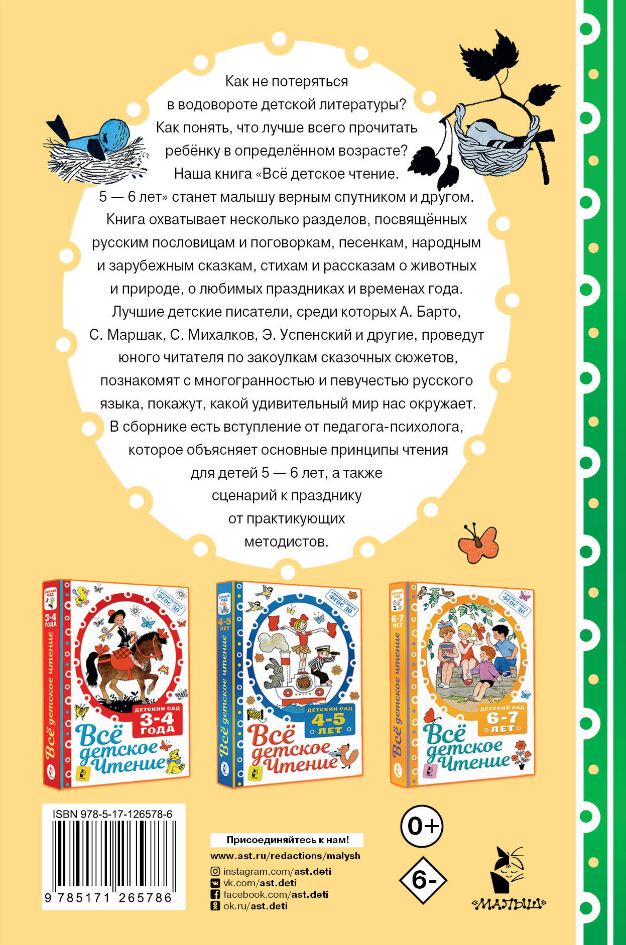 В книгу "Всё детское чтение. 5-6 лет" вошли песенки, загадки, пословицы и поговорки, стихи, рассказы, а также народные, русские и зарубежные сказки, рекомендованные для детей 5-6 лет. Книга делится на разделы, каждый из которых познакомит ребёнка с фольклором, песенками и народными сказками, стихотворениями и рассказами о природе, о животных, о детях, о любимых праздниках. Все произведения подобраны таким образом, чтобы ребёнок охватил необходимый максимум, рекомендованный к прочтению в возрасте 5-6 лет. В книгу вошли произведения А. Барто, С. Маршака, С. Михалкова. Э. Успенского, В. Драгунского, Г. Остера и многих других известных писателей. Вступительное слово от педагога-психолога Т. Савельевой объяснит основные принципы чтения для детей 5-6 лет и важность расширения кругозора ребёнка в этом возрасте. В конце книги бонусом дан сценарий к празднику от практикующих методистов по мотивам одной из сказок. Книга предназначена для самостоятельного чтения ребёнком, для педагогов, для вопитателей детских садов. Для дошкольного возраста.| Издательство | ИЗДАТЕЛЬСТВО "АСТ" |