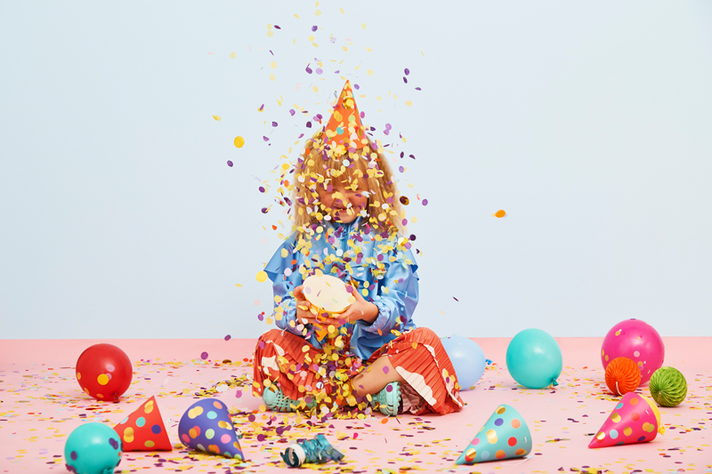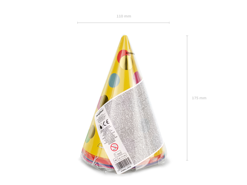 Party hats in 6 colours with colorful and gold dots, height approx. 16 cm, diameter approx. 11 cm.