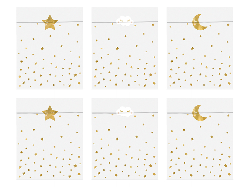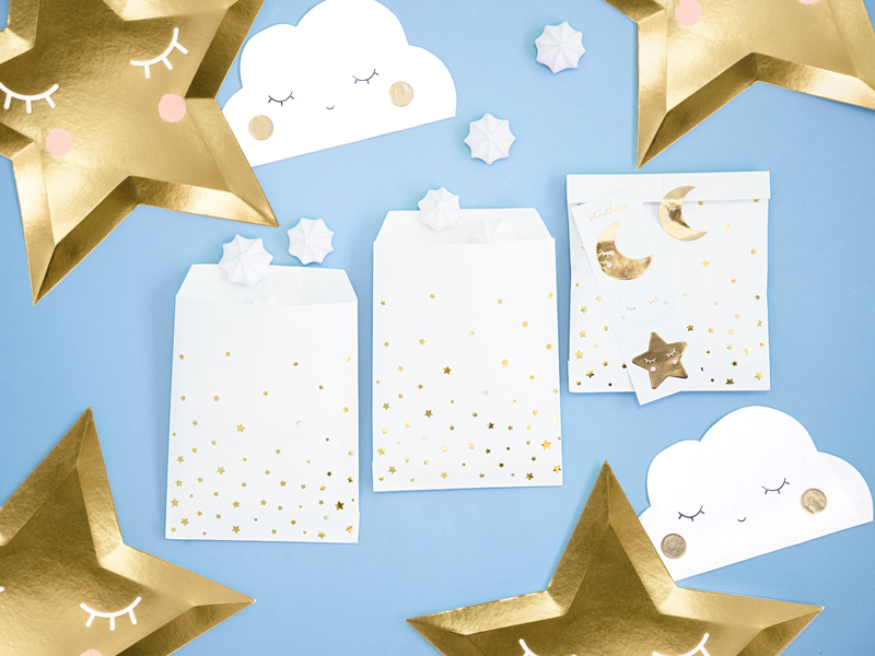 Treat bags Little Star made of paper with gold mettallic pattern, set cotains 6 bags and 6 stickers, size after assembling approx. 13 x 14cm.<BR>(1 pkt / 6 pc.)