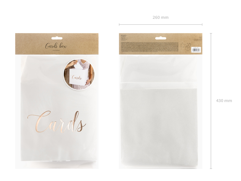 Wedding card box made of white paper with metallic rose gold inscription Cards, size after assembling approx. 24 x 24 x 24 cm.