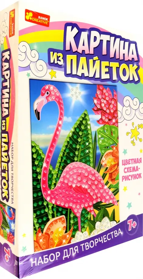 Набор содержат все необходимое для работы. Цветные пайетки крепятся специальными гвоздями к схеме на пенопластовых основе. Такой вид творчества интересен не только детям разного возраста, но даже взрослым.