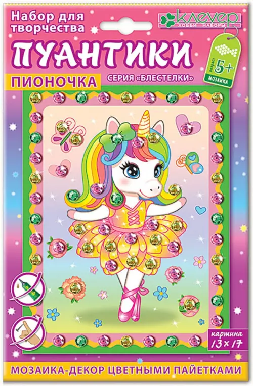Маленькая балерина-единорог в образе пышного пиона танцует на цветочной поляне среди бабочек! Мини-картина «Пионочка. Пуантики» - первые шаги ребёнка старше 5 лет в освоении техники мозаики. Предлагаем самый простой пример мозаики - не сплошное составление картины из мелких элементов, а декорирование её отдельных частей. Маленький творец легко сделает прекрасную картину, ведь клеить пайетки совсем не сложно, аккуратно, чисто и безопасно!