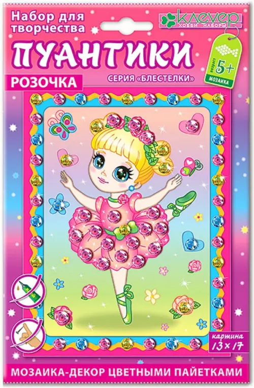 Маленькая девочка-балерина в образе нежной розочки танцует на цветочной поляне! Мини-картина «Розочка. Пуантики» - первые шаги ребёнка старше 5 лет в освоении техники мозаики. Предлагаем самый простой пример мозаики - не сплошное составление картины из мелких элементов, а декорирование её отдельных частей. Маленький творец легко сделает прекрасную картину, ведь клеить пайетки совсем не сложно, аккуратно, чисто и безопасно!