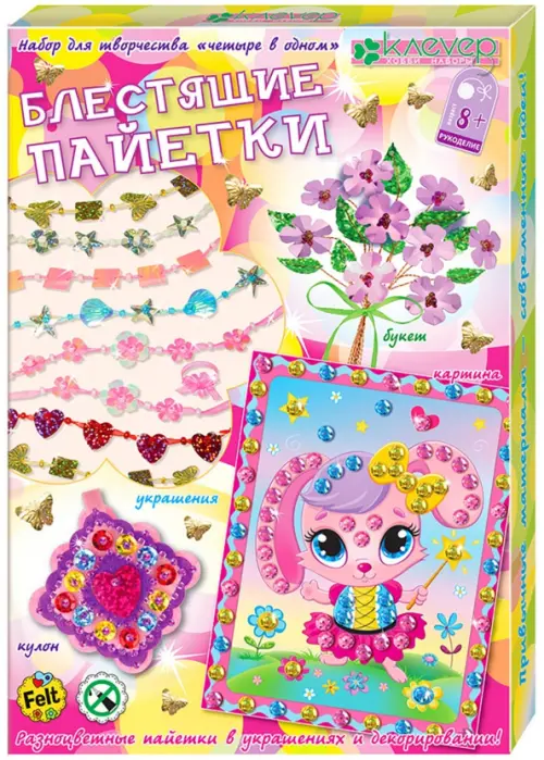 Состав набора: фигурные пайетки, фетр, бисер, проволока, ленты, картина-основа, скотч, инструкция.
