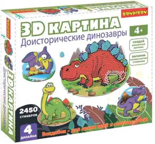 Набор "3D Доисторические динозавры" с самоклеящимися стикерами - яркое, интересное творчество, которое обязательно придется по вкусу вашему ребёнку. Стикеры отличаются по цвету, каждый цвет имеет определённый номер. Эти номера так же нанесены на картах-основах, в наборе их 4. Немного усердия и собранный вашим ребёнком шедевр станет хорошим украшением интерьера его комнаты или замечательным подарком для друга!