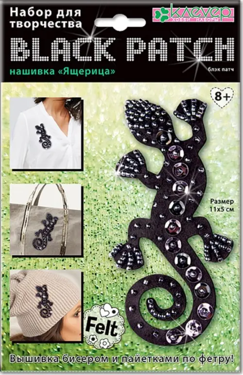Элегантность и блеск чёрного цвета - в модной серии нашивок "Black patch"! Готовая фигурка из фетра - изящный силуэт ящерицы, бисер с эффектом гематита и мерцающие пайетки помогут создать дизайнерское изделие и украсить им любимое однотонное платье, сумочку или головной убор!