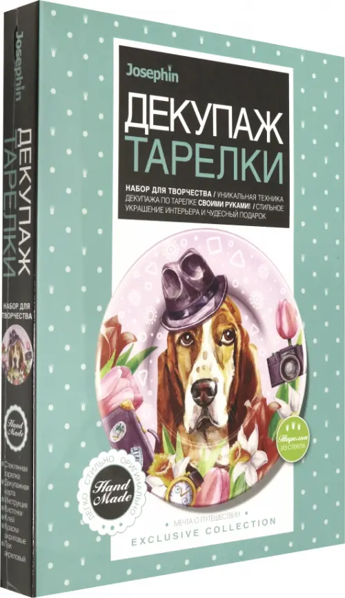 В набор входит: стеклянная тарелка, краски, лак, клей, кисти, декупажная карта, инструкция.
