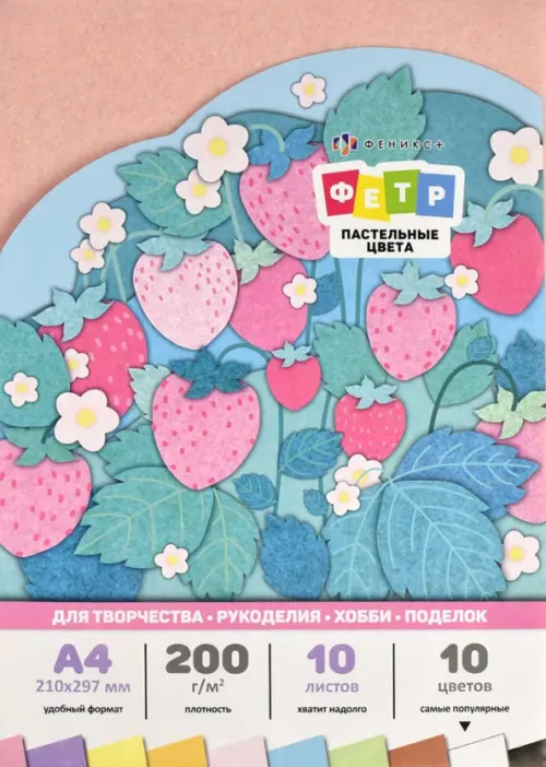 Фетр цветной А4, арт. 65998/ 20 ФЕТР ПАСТЕЛЬНЫХ ОТТЕНКОВ (10 ЦВЕТОВ) (размер 210х297 мм, 10 листов, 10 цветов, флат-листы плотностью 200 г/м2, обложка: обложка-вкладыш, мелованная бумага 115 г/м2, полноцветная печать; индивидуальная упаковка: ПЭТ-пакет с европодвесом)