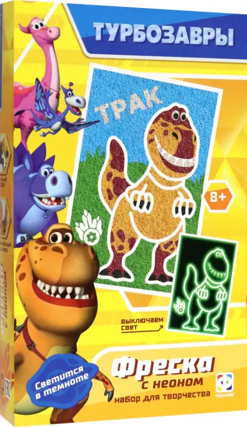 Светящаяся картина, которую можно сделать своими руками, с героями популярного мультфильма «Турбозавры» обязательно понравится вашему ребенку! Благодаря уникальной технологии с использованием неонового порошка волшебная фреска светится в темноте.