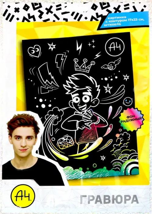 Самый популярный блоггер с 40миллионной аудиторией Влад А4 теперь в гравюрах. Это - уникальный вид творчества. Под черным слоем напыления скрыт радужный слой, который будет проявляться по мере процарапывания картинки по белому контуру.