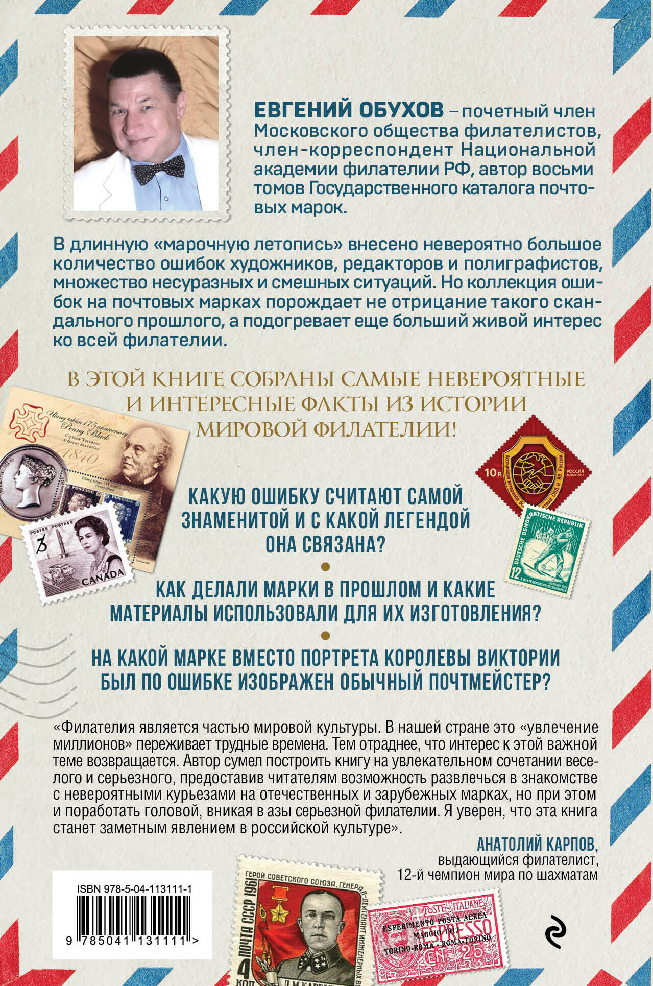 В длинную «марочную летопись» внесено невероятно большое количество ошибок художников, редакторов и полиграфистов, множество несуразных и смешных ситуаций. Но коллекция ошибок на почтовых марках порождает не отрицание такого скандального прошлого, а подогревает еще больший живой интерес ко всей филателии. В этой книге собраны самые невероятные и интересные факты из истории мировой филателии! - Когда появилась первая в мире марка и кто был «отцом» русской филателии? - Какую ошибку считают самой знаменитой и с какой легендой она связана? - Как делали марки в прошлом и какие материалы использовали для их изготовления? - На какой марке вместо портрета королевы Виктории был по ошибке изображен обычный почтмейстер? - Самые известные сюжетные и исторические ошибки на марках мира. «Филателия является частью мировой культуры. В нашей стране это "увлечение миллионов" переживает трудные времена. Тем отраднее, что интерес к этой важной теме возвращается. Автор сумел построить книгу на увлекательном сочетании веселого и серьезного, предоставив читателям возможность развлечься в знакомстве с невероятными курьезами на отечественных и зарубежных марках, но при этом и поработать головой, вникая в азы серьезной филателии. Я уверен, что эта книга станет заметным явлением в российской культуре». - Анатолий КАРПОВ, выдающийся филателист, 12-й чемпион мира по шахматам. Евгений Обухов - почетный член Московского общества филателистов, член-корреспондент Национальной академии филателии РФ, автор восьми томов Государственного каталога почтовых марок.| Издательство | ООО "Издательство "Эксмо" |