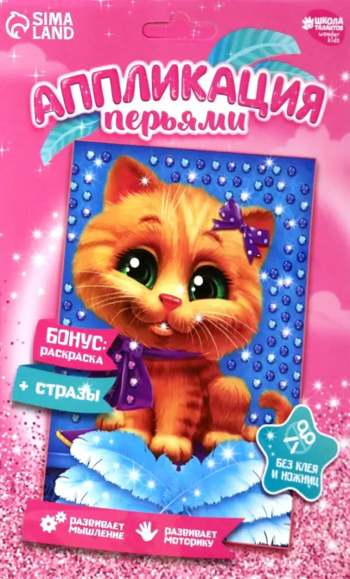 Набор для творчества. Аппликация перьями и стразами «Котик» 14,8 х 21 см + бантик развивает мелкую моторику и координацию движений, креативное зрительное восприятие, усидчивость, аккуратность, внимательность и формирует художественный вкус.
