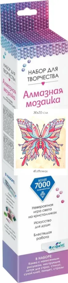 В наборе: канва с нанесенным рисунком, инструкция, лоток для страз, стилус, сухой клей, пинцет, стразы.