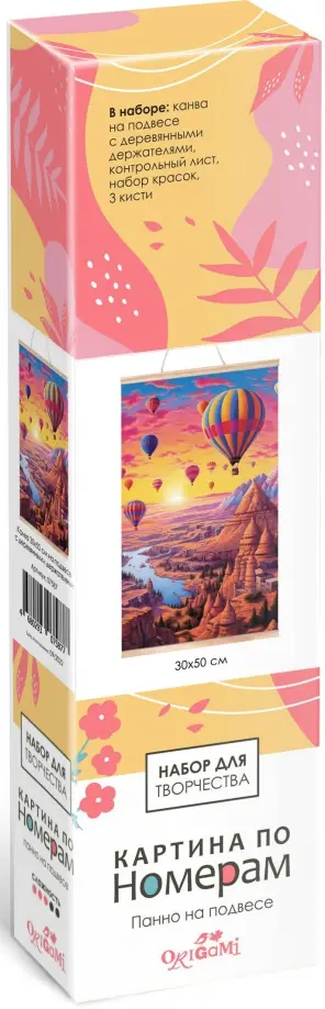 В наборе: холст с нанесенным контурным рисунком, 3 кисточки, акриловые краски, контрольный лист.